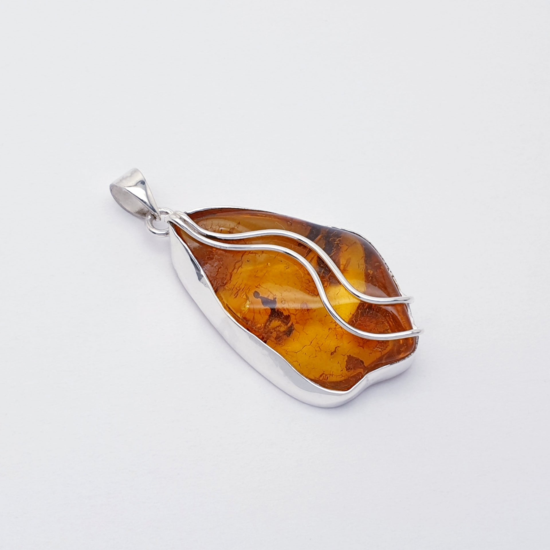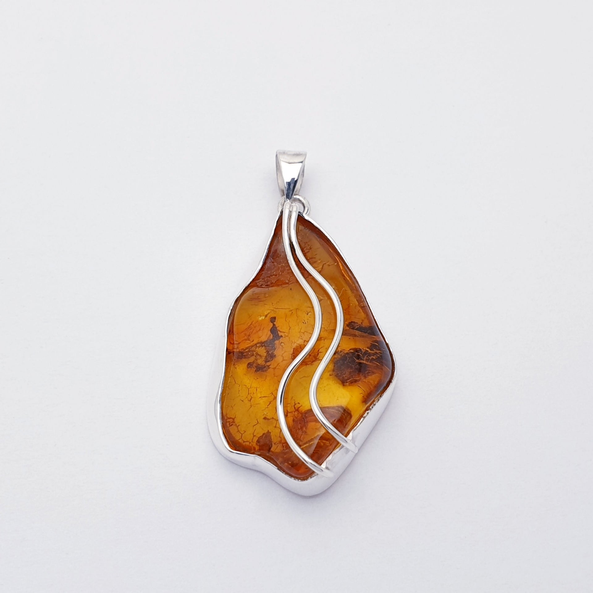 Our One-Off Amber Sterling Silver Pan Pendant features a beautifully shaped piece of natural Amber, set in sterling silver and accented with flowing silver detailing. Our silversmiths have followed the free form shape of the Amber stone to create a beautiful and unusual piece. The warm honey tones and unique inclusions within the Amber make this pendant truly one of a kind, capturing the organic beauty of this ancient stone. Elegant yet striking, it’s a meaningful statement piece that brings warmth and individuality to any jewellery collection.