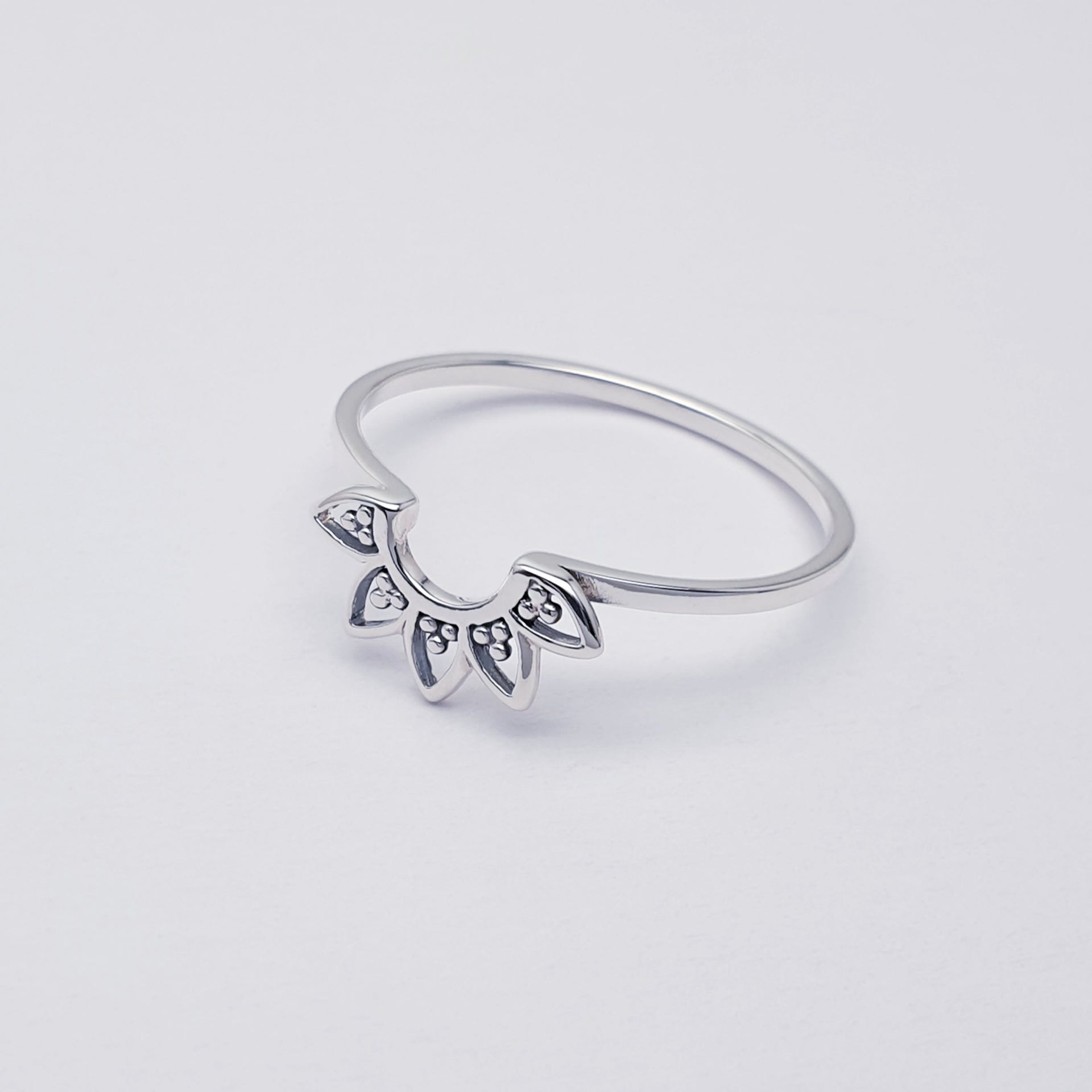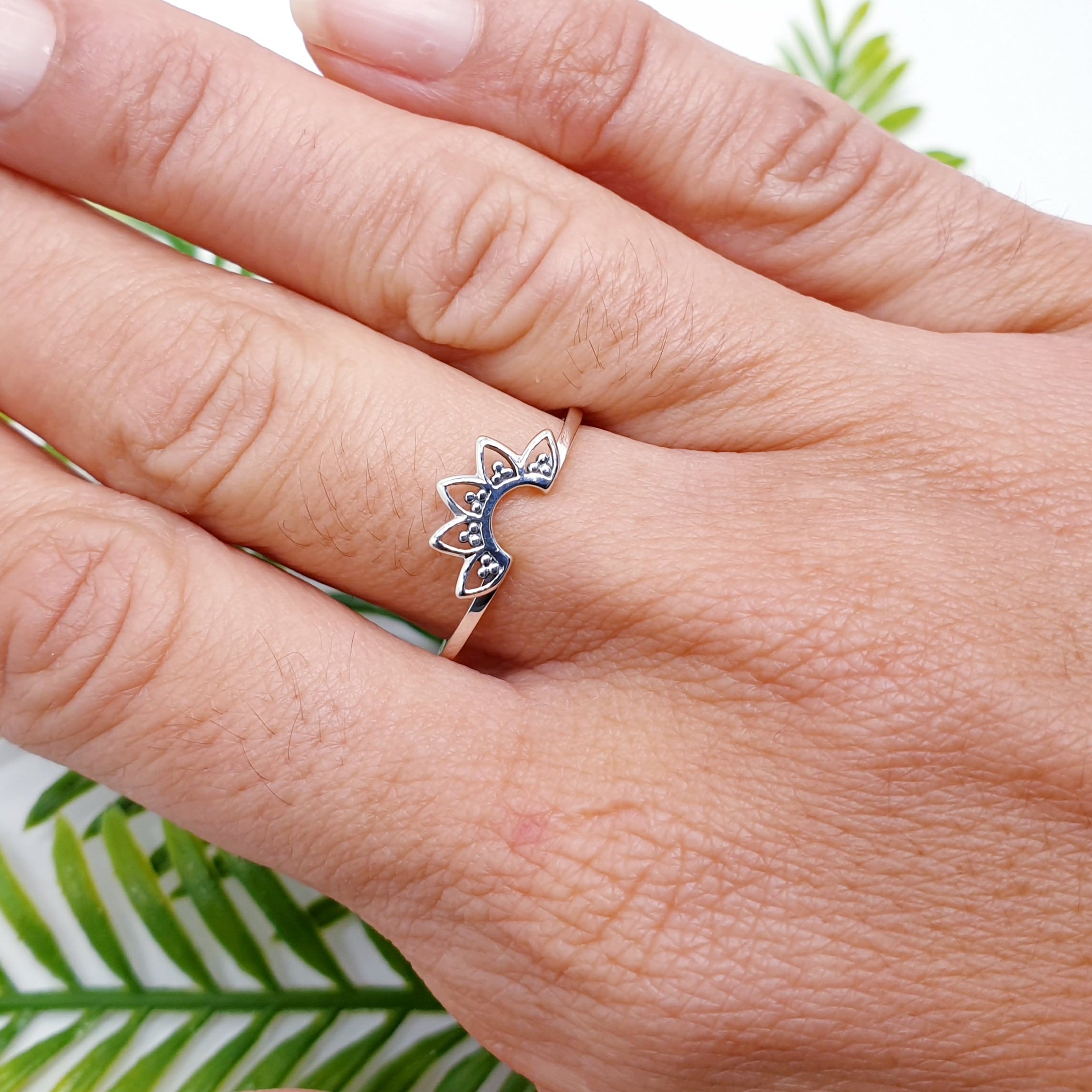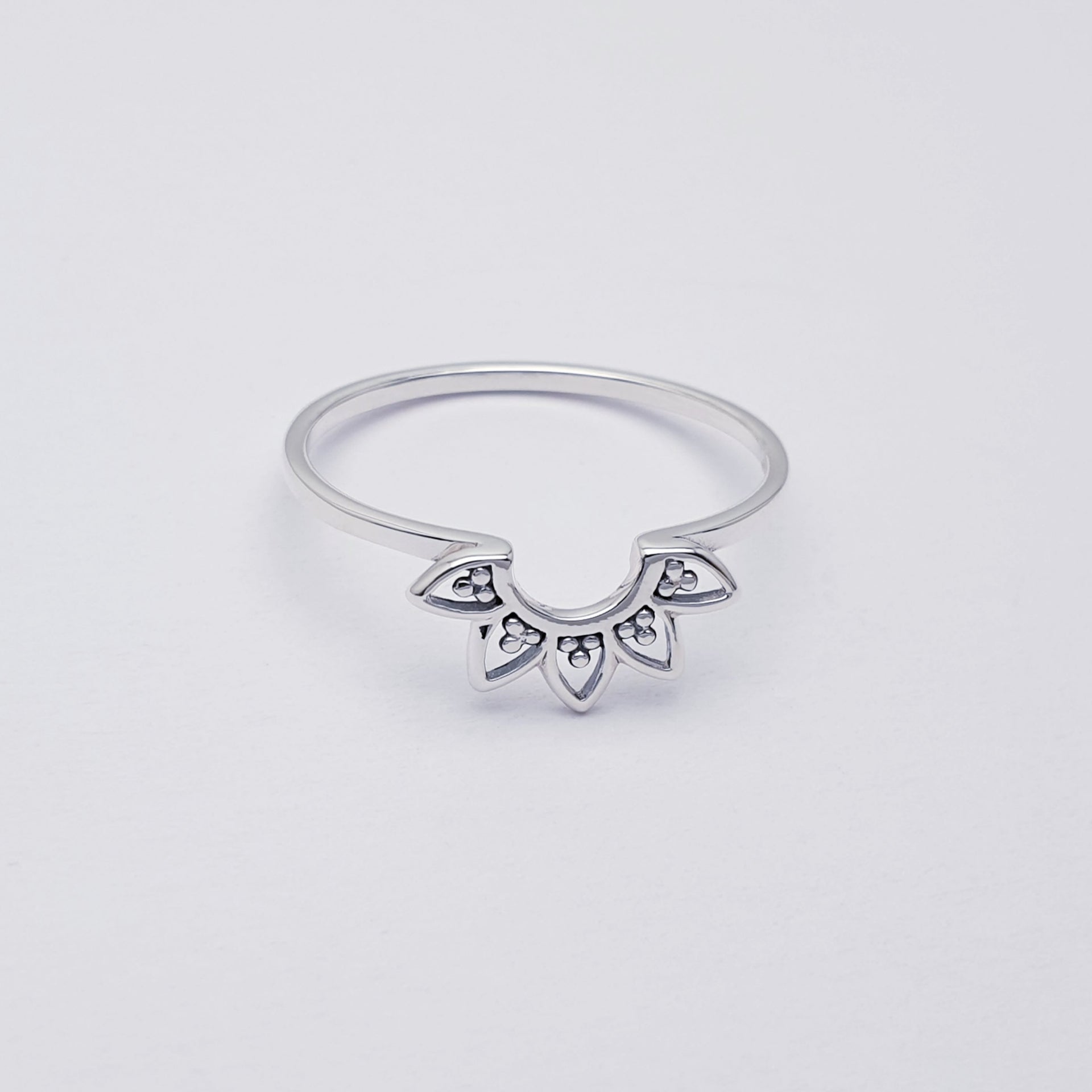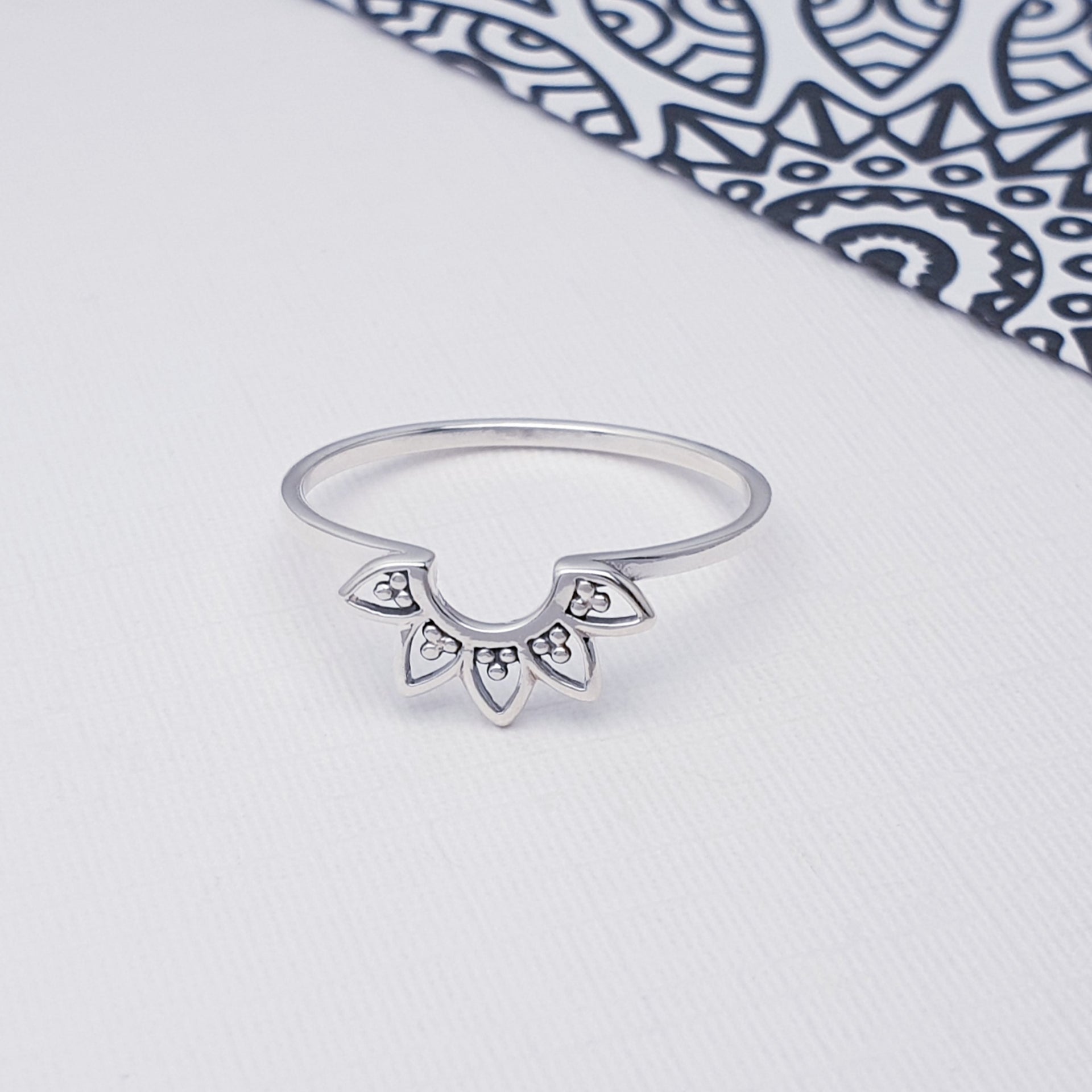 Our Sterling Silver Dainty Mandala Stacking Ring features a delicate mandala design with an oxidised finish, symbolising balance, harmony, and wholeness. Crafted with a slim, polished band, this ring is perfect for stacking with other favourites or wearing alone for a subtle, meaningful touch. Lightweight and versatile, it’s an easy everyday piece with timeless appeal.