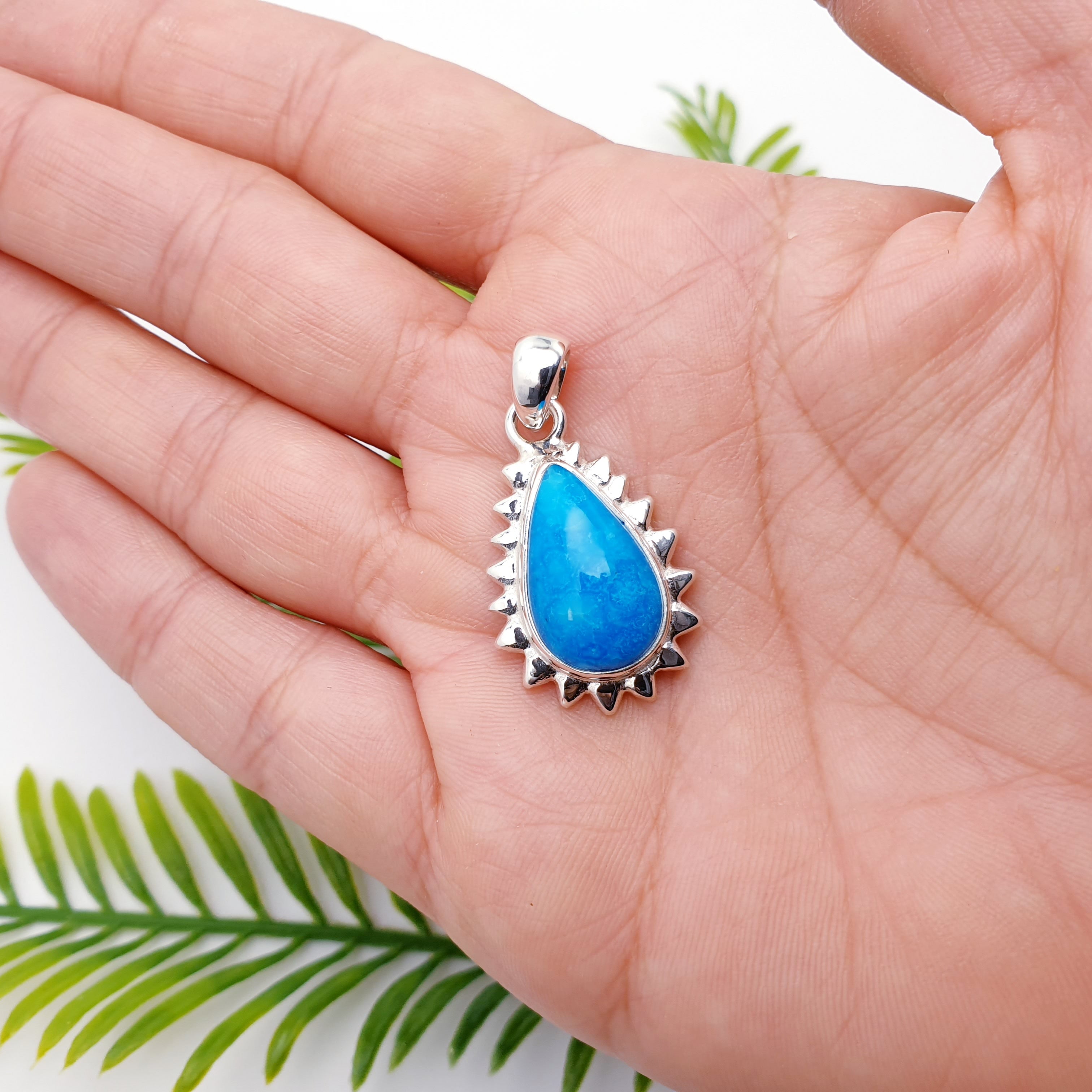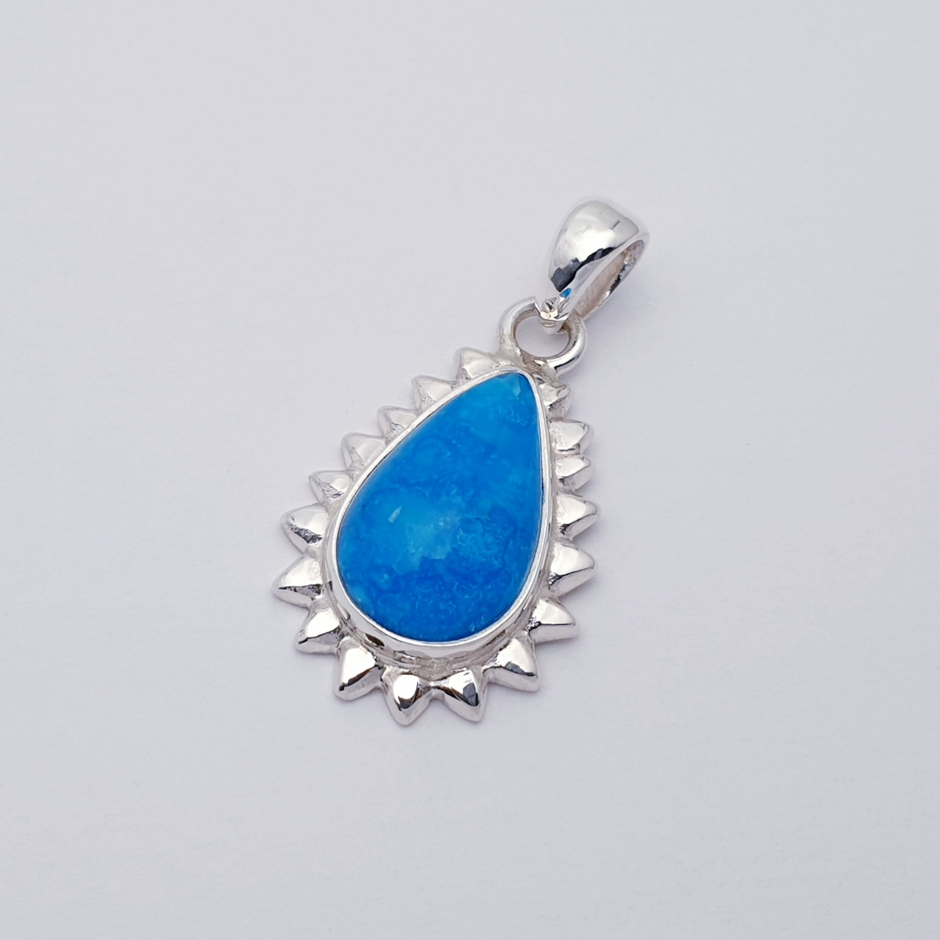 Our Turquoise Sterling Silver Sunburst Pendant radiates warmth and uplifting colour. At its centre sits a beautifully polished Turquoise stone, glowing with its signature sky-blue tones. The teardrop stone is framed by a striking sunburst design in sleek Sterling Silver, giving the piece a bright, joyful energy that feels like wearing a little piece of sunshine.