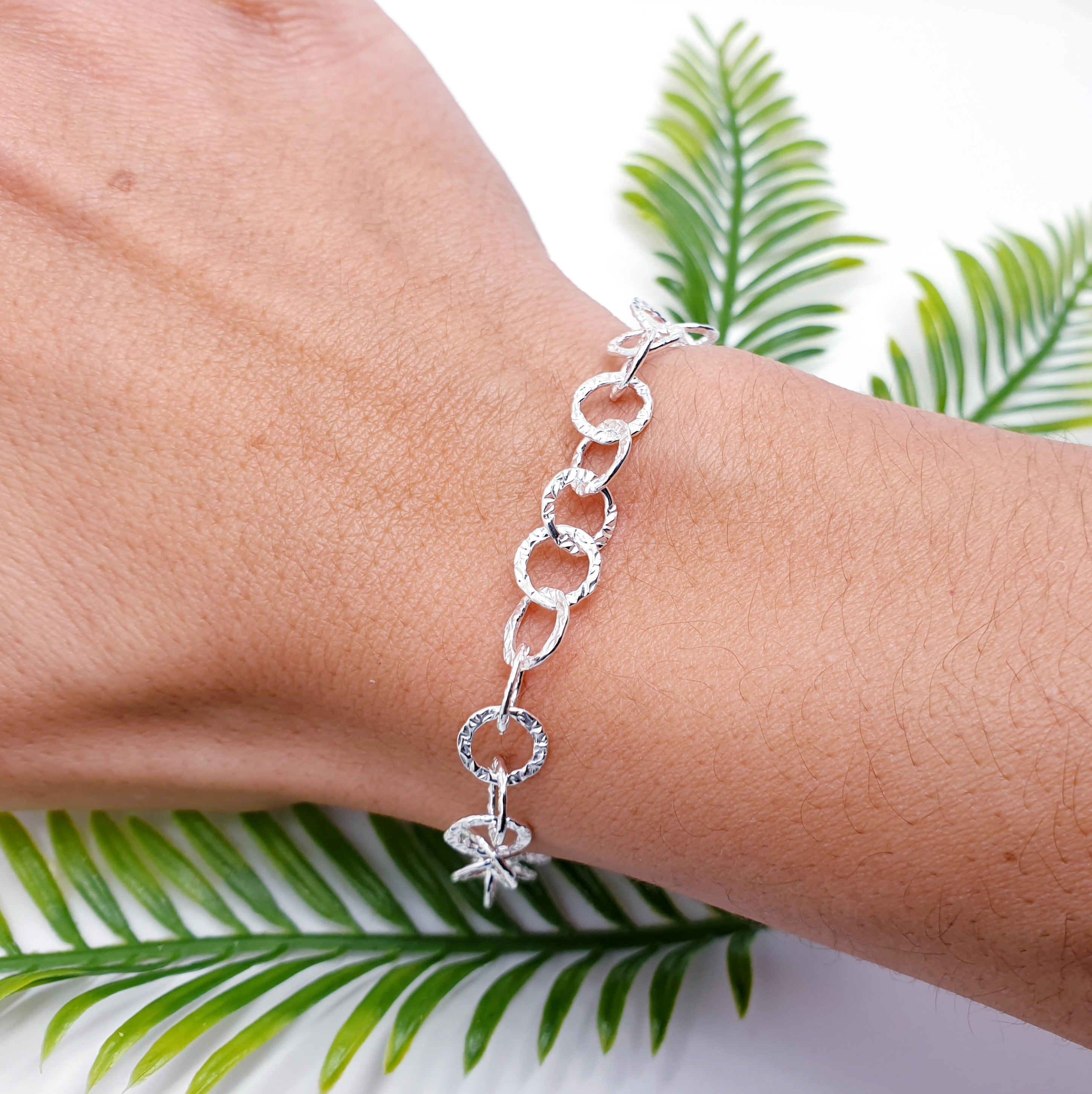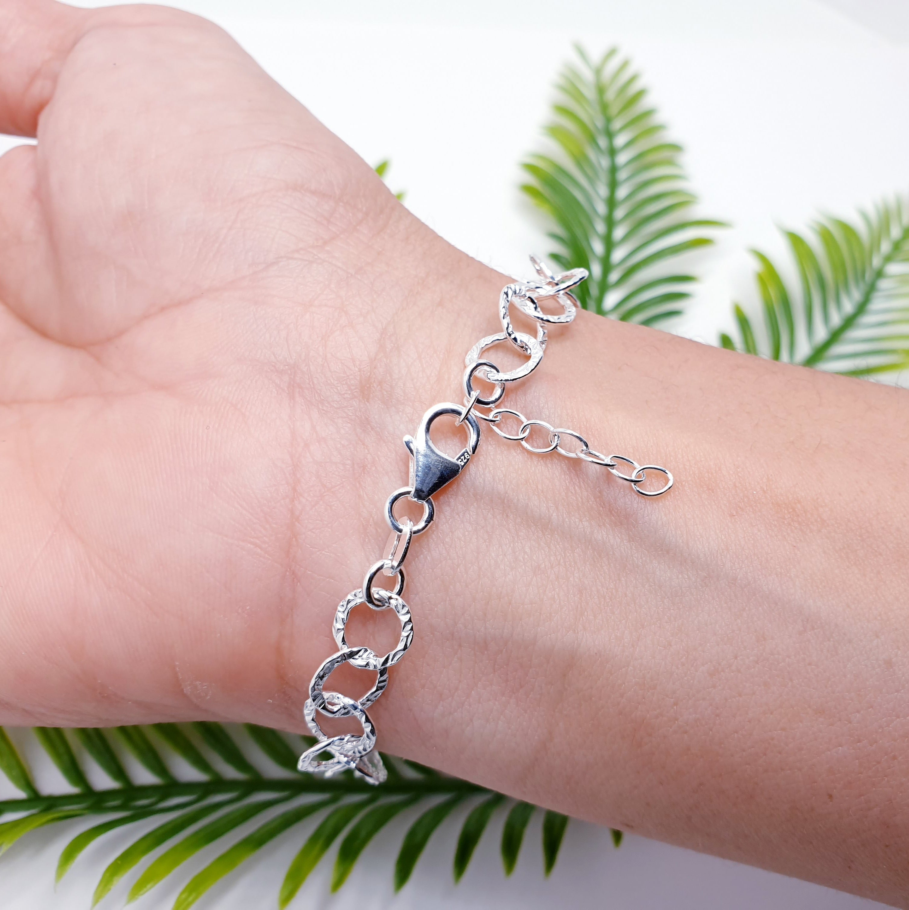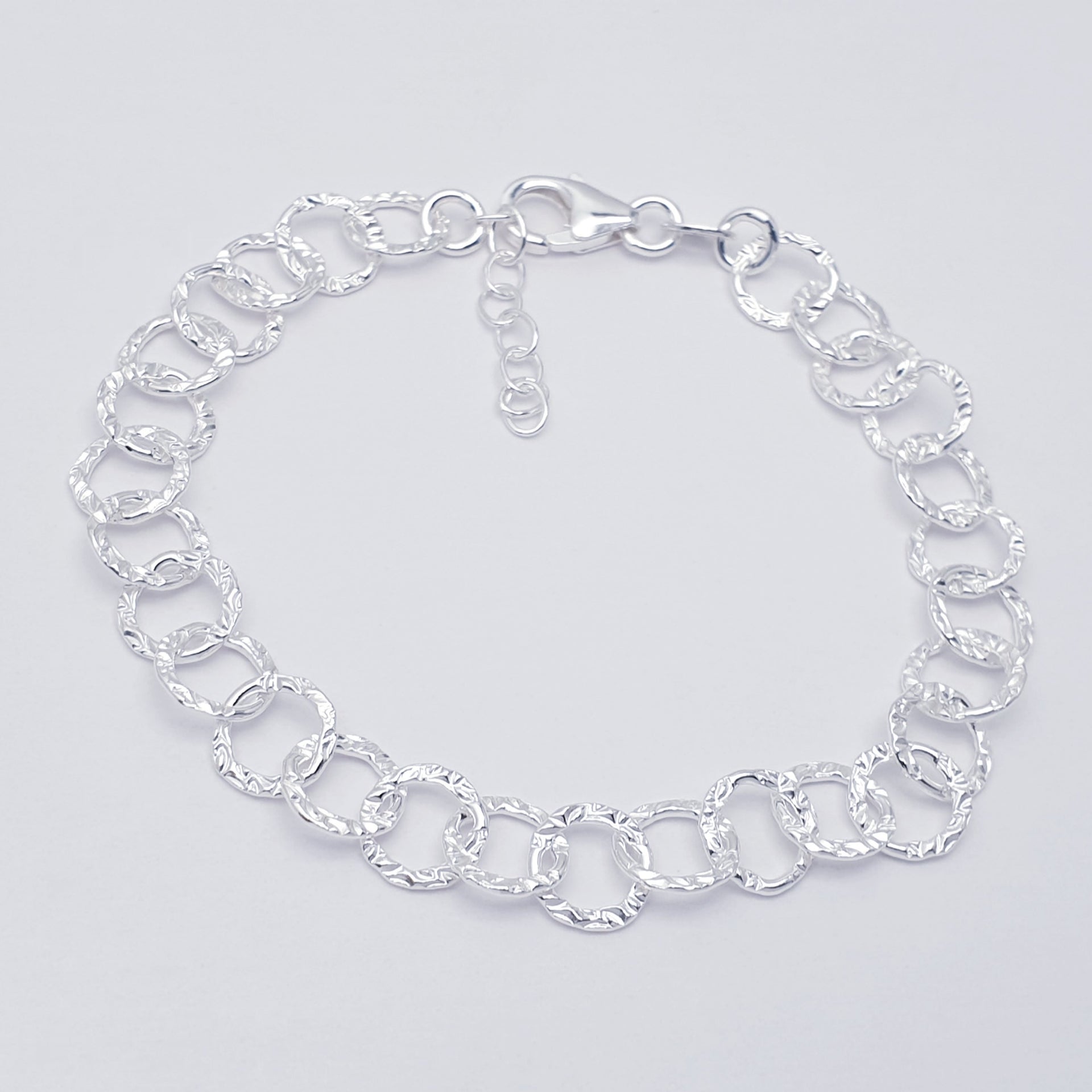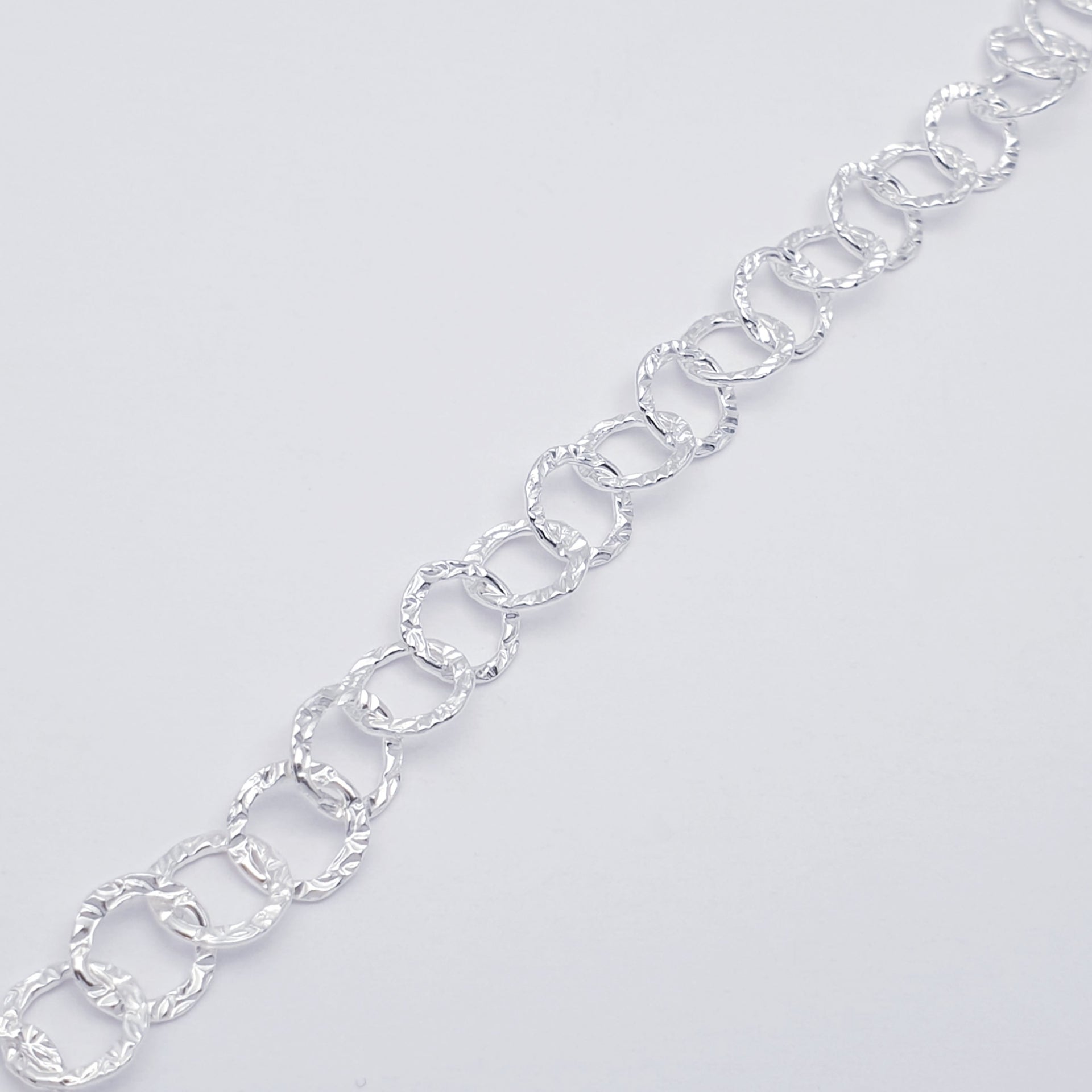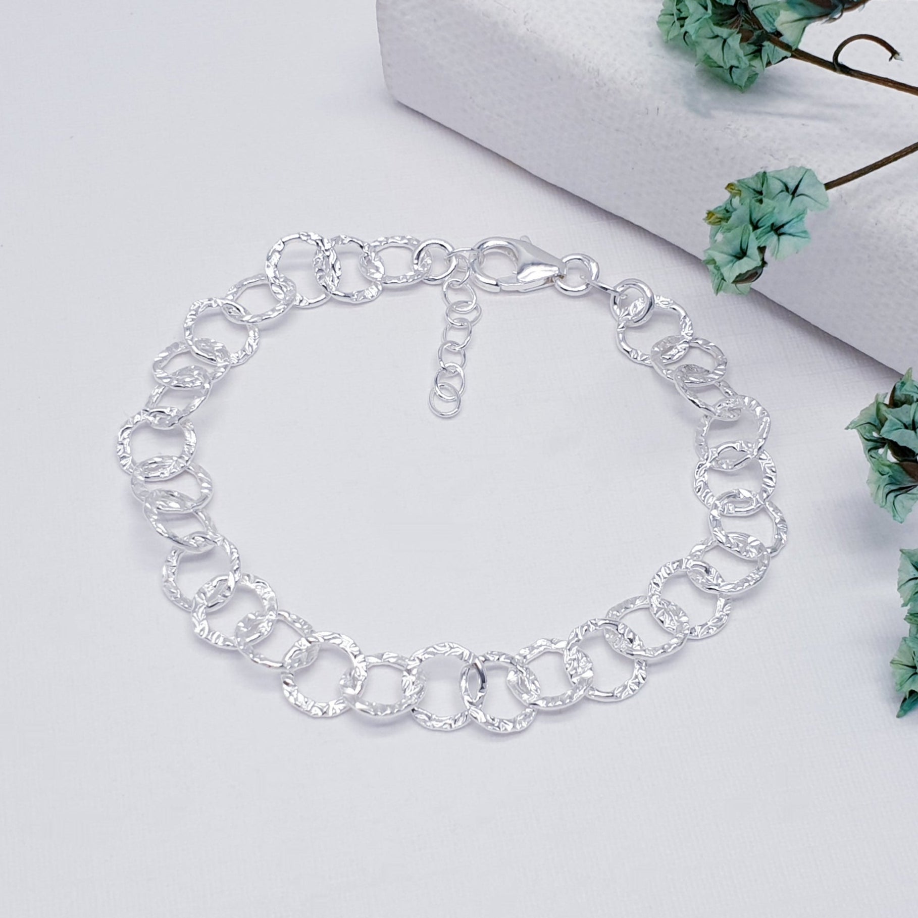 Elevate your everyday style with our beautifully crafted Sterling Silver Textured Link bracelet. Designed with a series of interlocking circular links, each piece features a subtle hammered texture that catches the light from every angle, creating a soft, radiant shimmer.