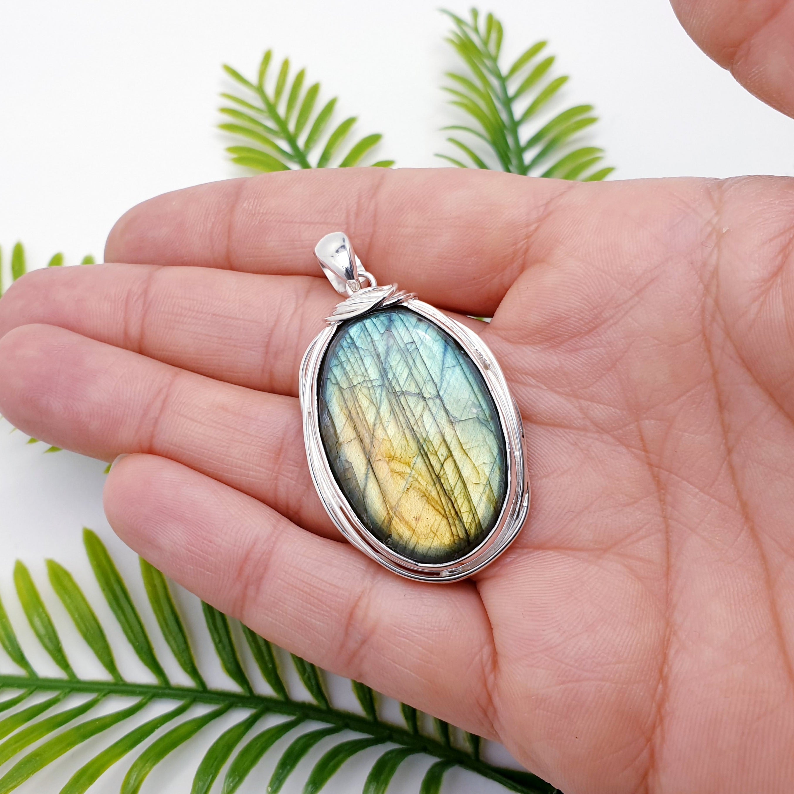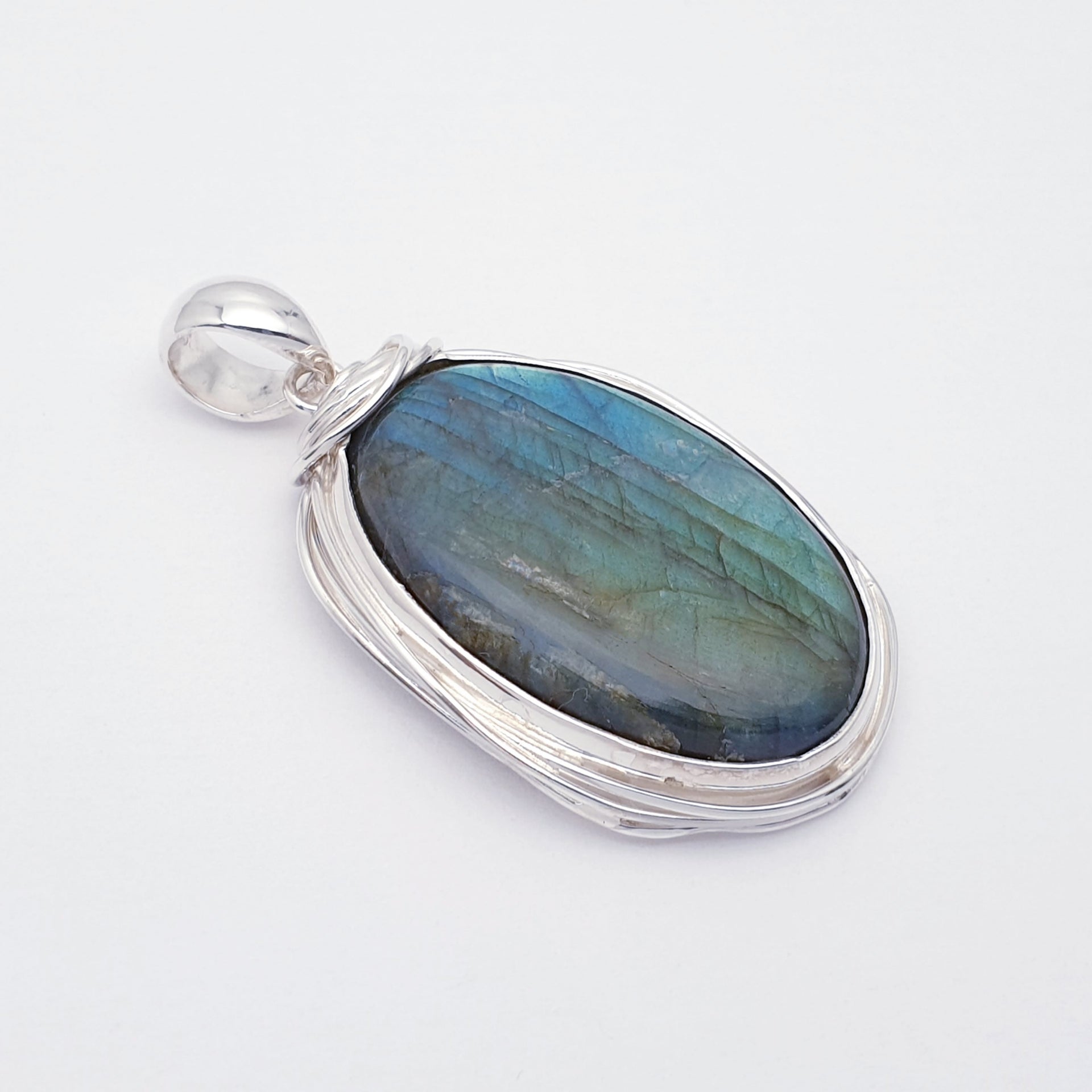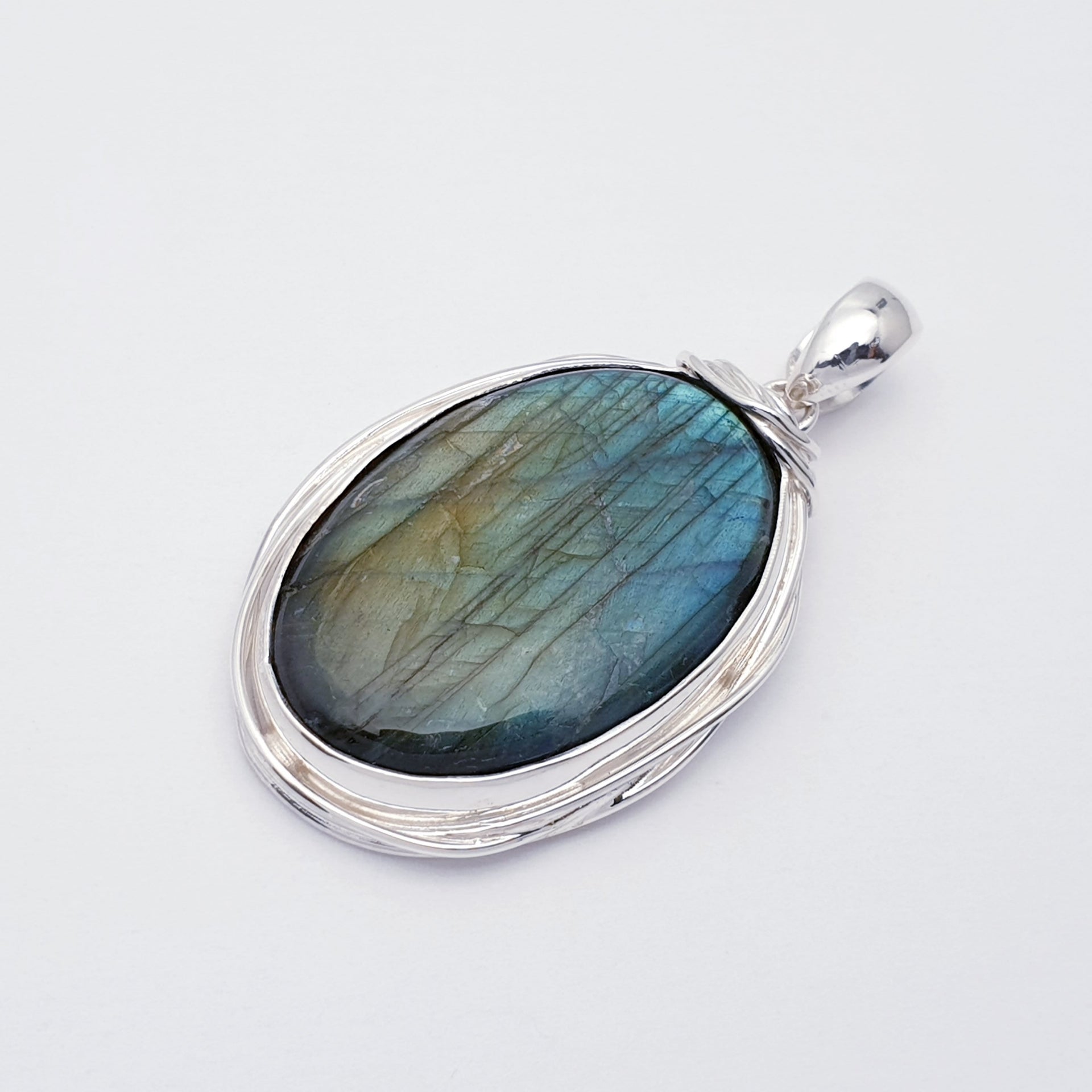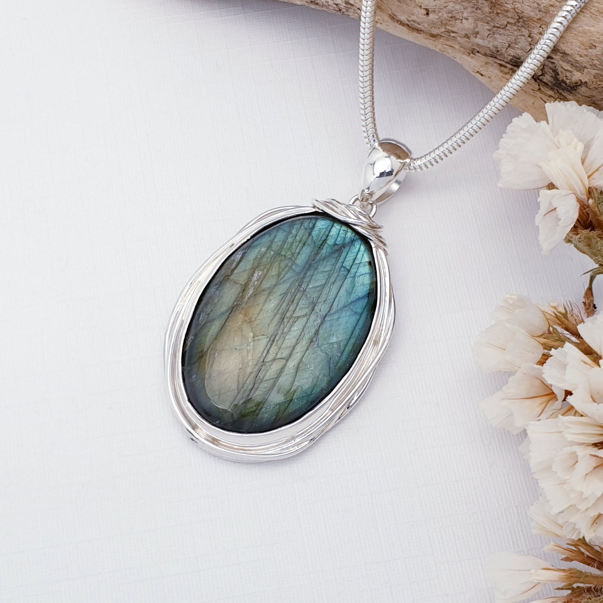 Our Labradorite Sterling Silver Freya Pendant features a stunning, large, oval Labradorite stone wrapped in flowing, textured Sterling Silver detailing. Known for its captivating flashes of blue, green, and gold, known as labradorescence, this mesmerising stone creates a piece that is both elegant and full of natural character, perfect for everyday wear.