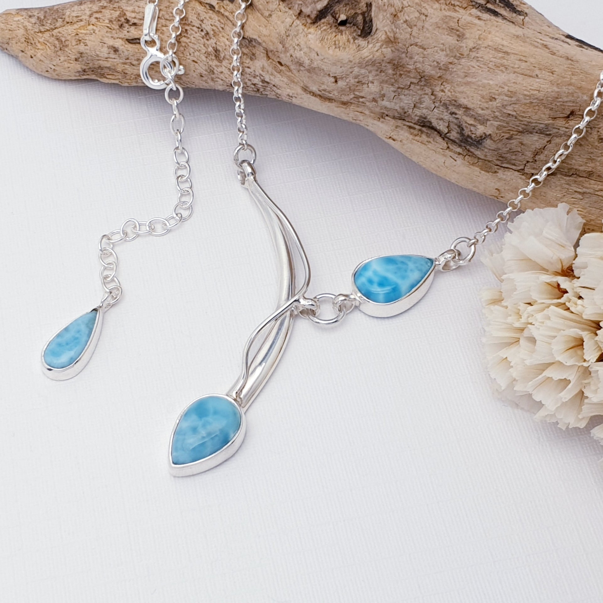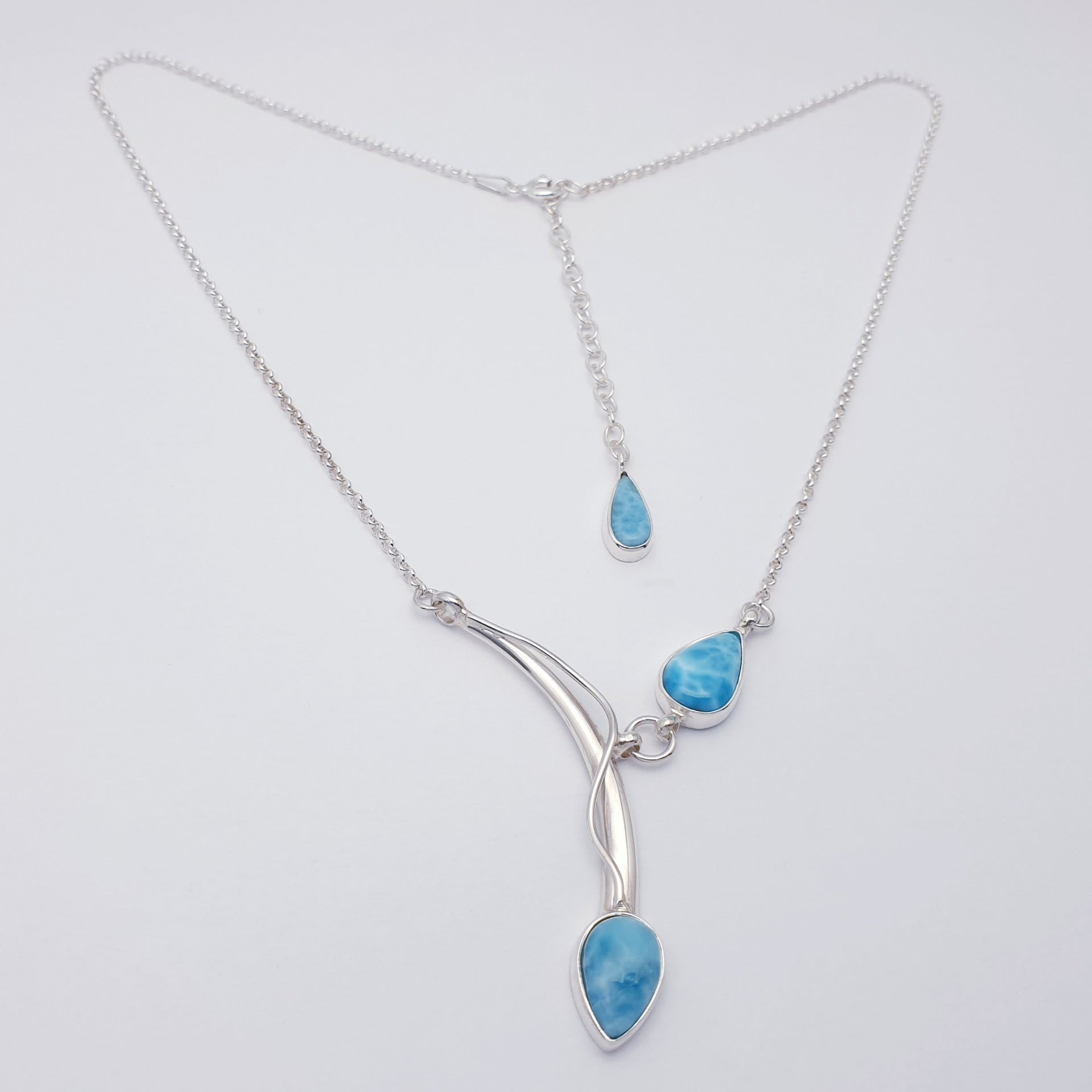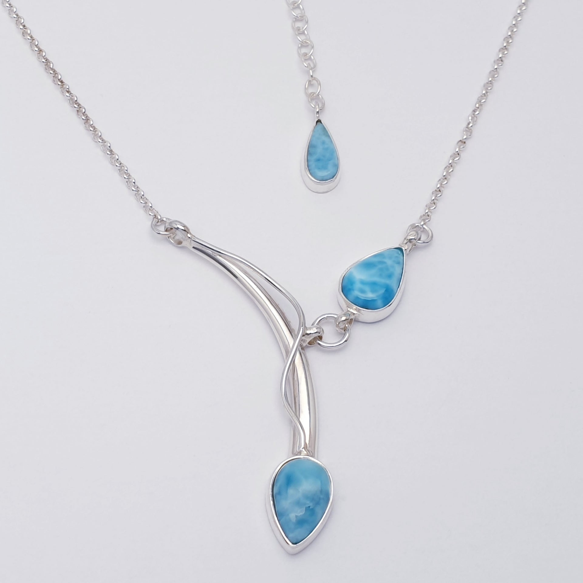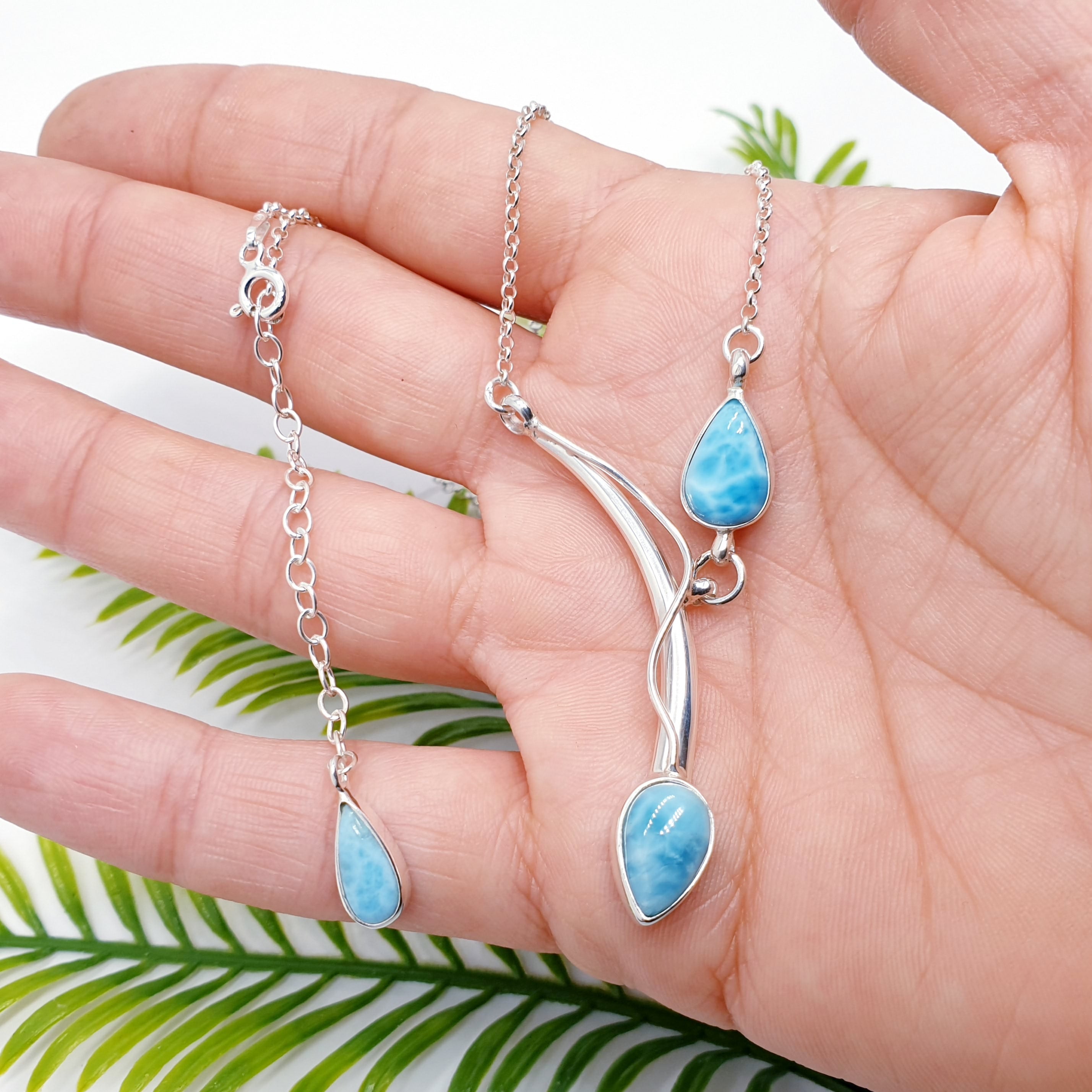 Our Larimar Sterling Silver Asymmetry Necklace features three beautifully polished Larimar stones arranged in a flowing, contemporary design. With their soothing sky-blue tones and soft organic patterns, the stones pair perfectly with the elegant sweeping silver lines, creating a calming yet eye-catching piece ideal for everyday wear.