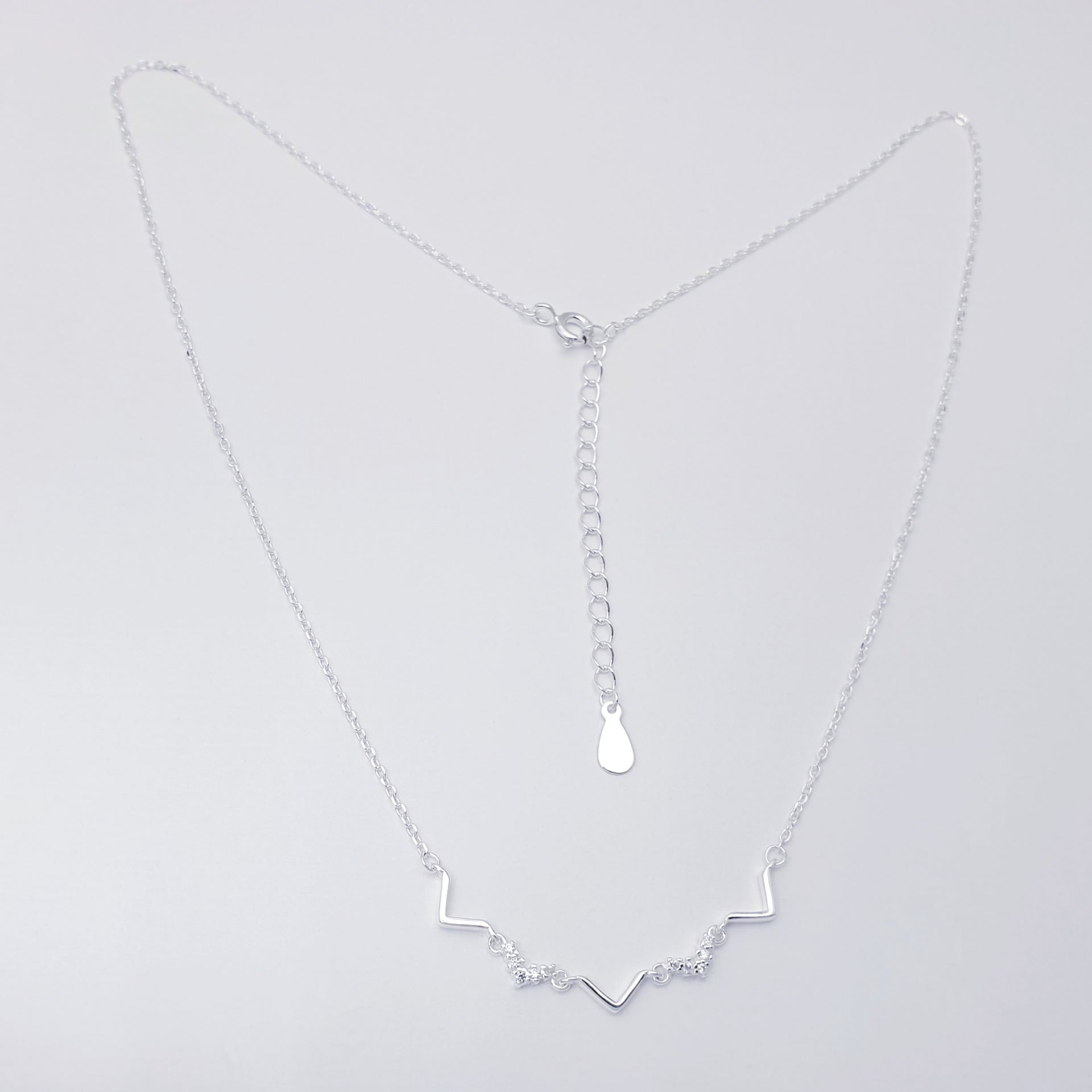 Our Sterling Silver Cubic Zirconia Dainty Necklace features a modern zig-zag design accented with clusters of sparkling Cubic Zirconia. Delicate, stylish, and perfect for adding a touch of shimmer to your everyday look.