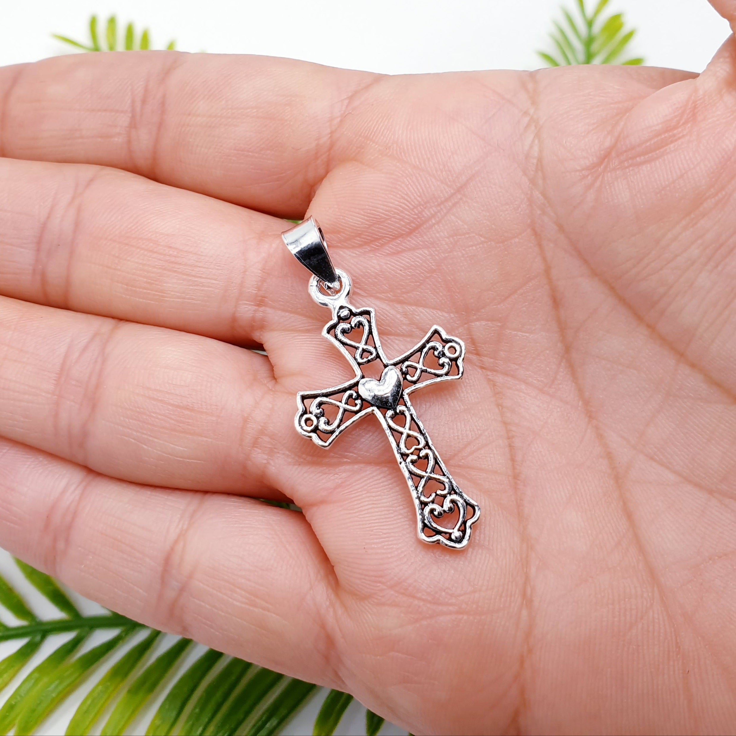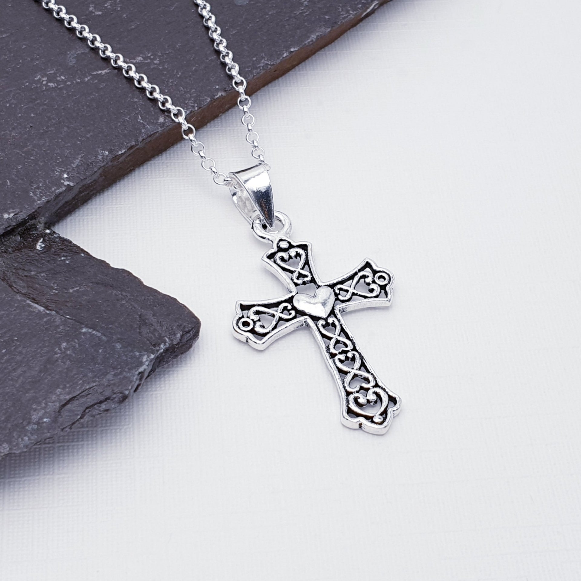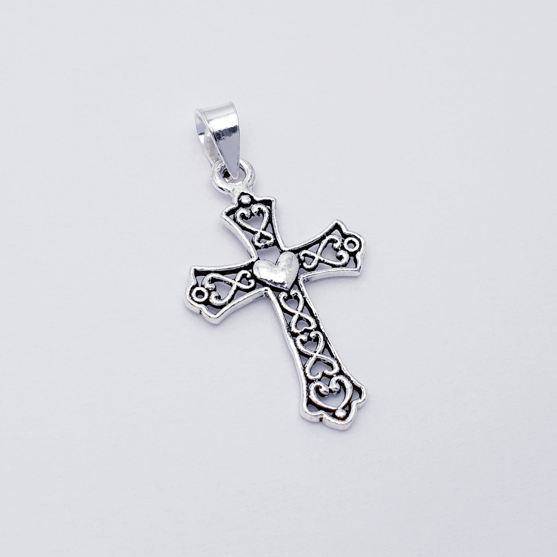 Our Sterling Silver Oxidised Heart and Cross Pendant features a softly shaped heart sitting at the centre of a sleek cross, finished with subtle oxidised detailing to enhance the depth and character of the design. The darkened accents highlight the contours of the Silver, giving the piece a beautifully aged and timeless look. Symbolising love, faith, and devotion, this pendant is both meaningful and effortlessly wearable.