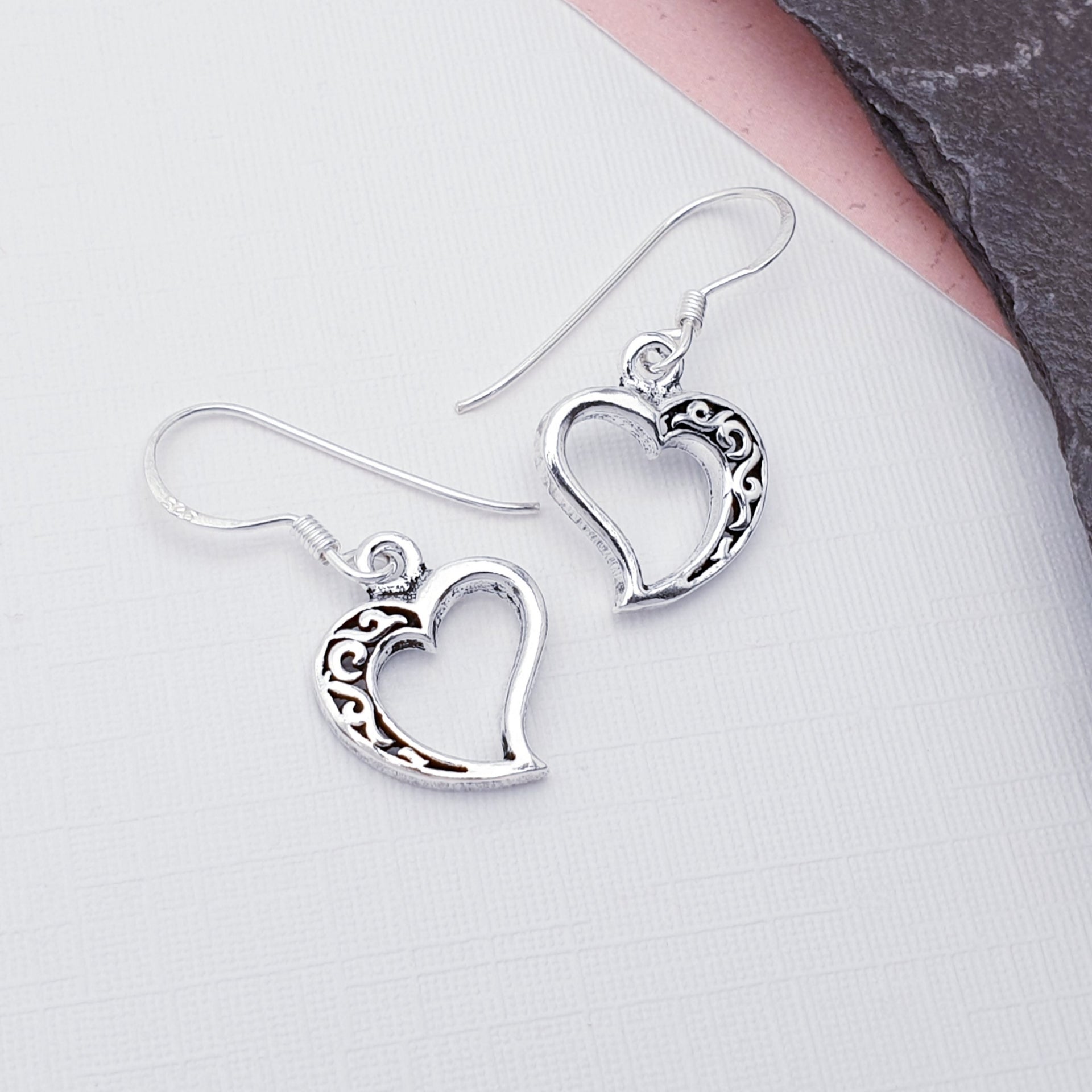 Our Sterling Silver Open Heart Earrings feature a beautifully simple open heart design, symbolising love, connection, and openness. Light and elegant, the open silhouette gives these earrings a timeless feel that’s easy to wear every day, while still carrying meaningful sentiment. As a finishing touch, oxidised swirls decorate one side of each heart. Perfect as a gift for a loved one or a treat for yourself.