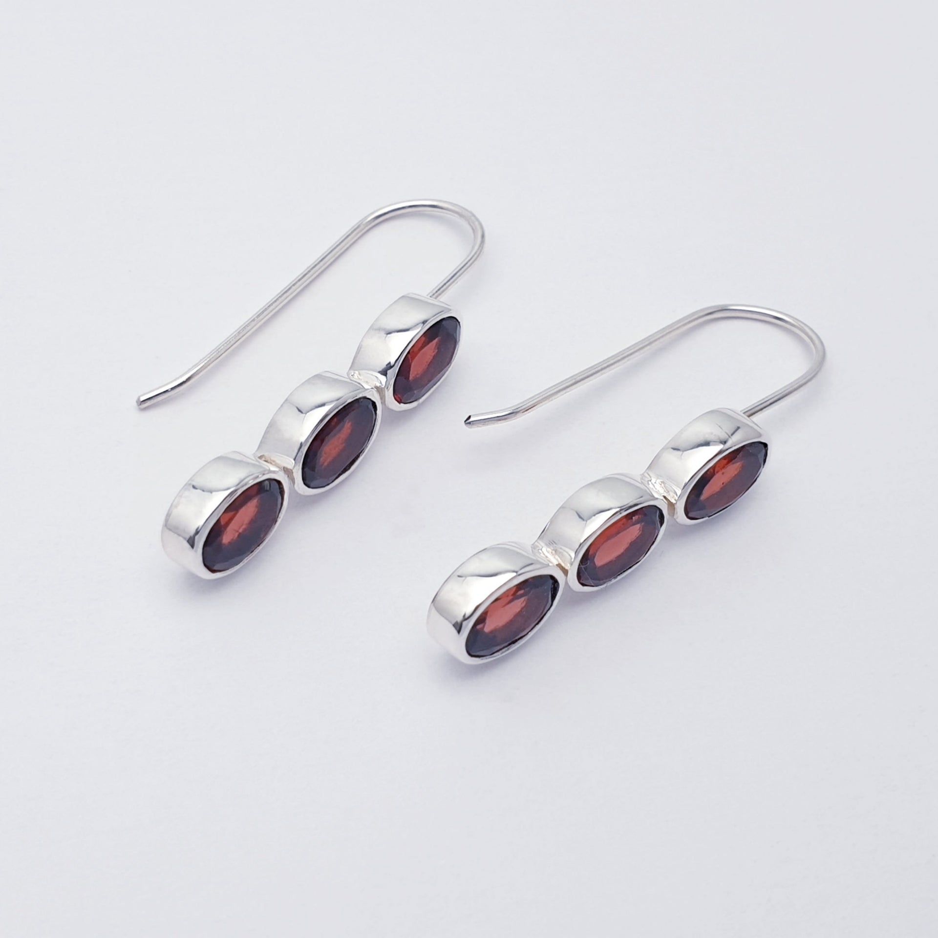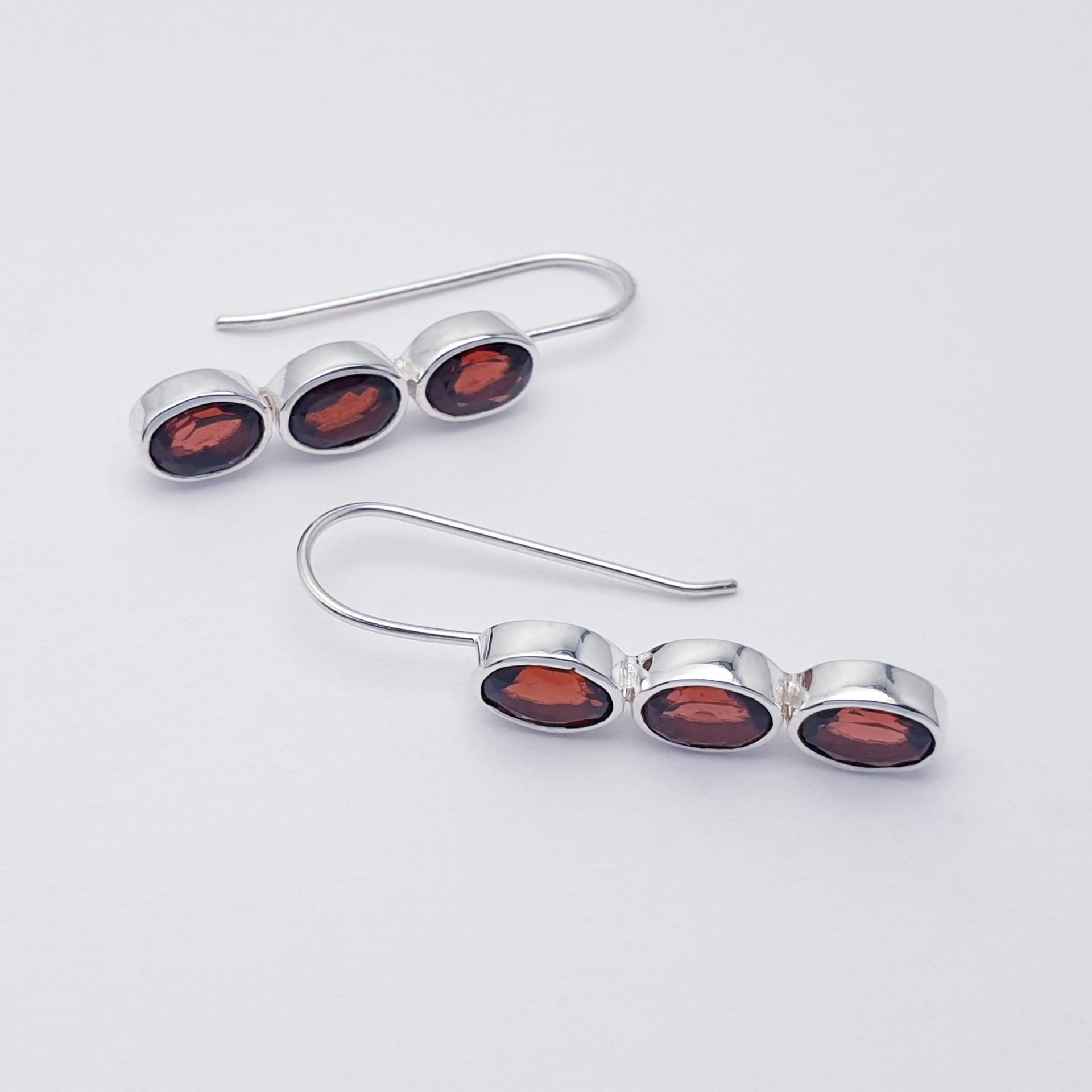With an understated design, each earring features three tabletop cut, oval shaped, Garnet stones in simple Sterling silver settings. The three stones are channel set with a fixed hook. Nice and simple, these little earrings are the perfect complement to any outfit or occasion.