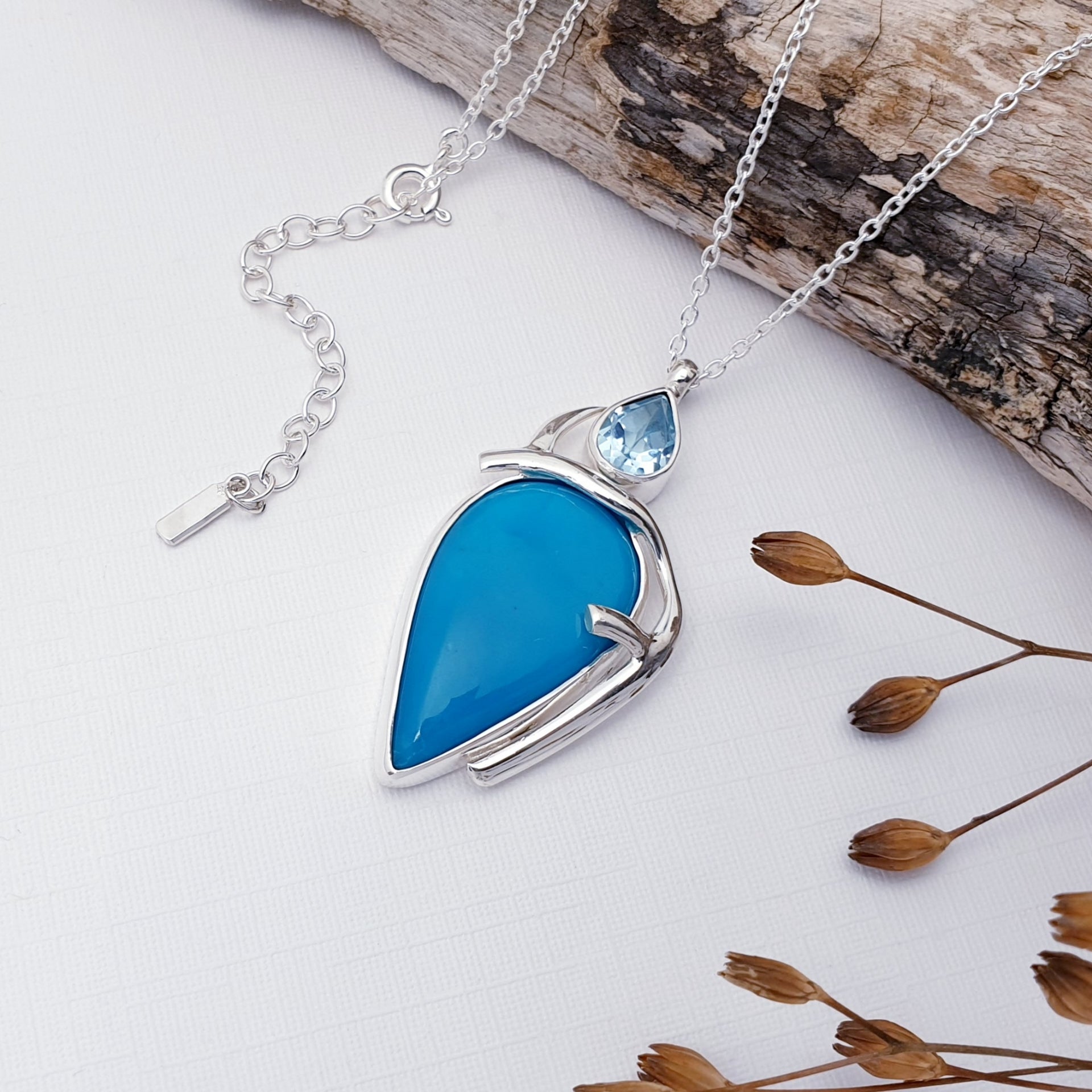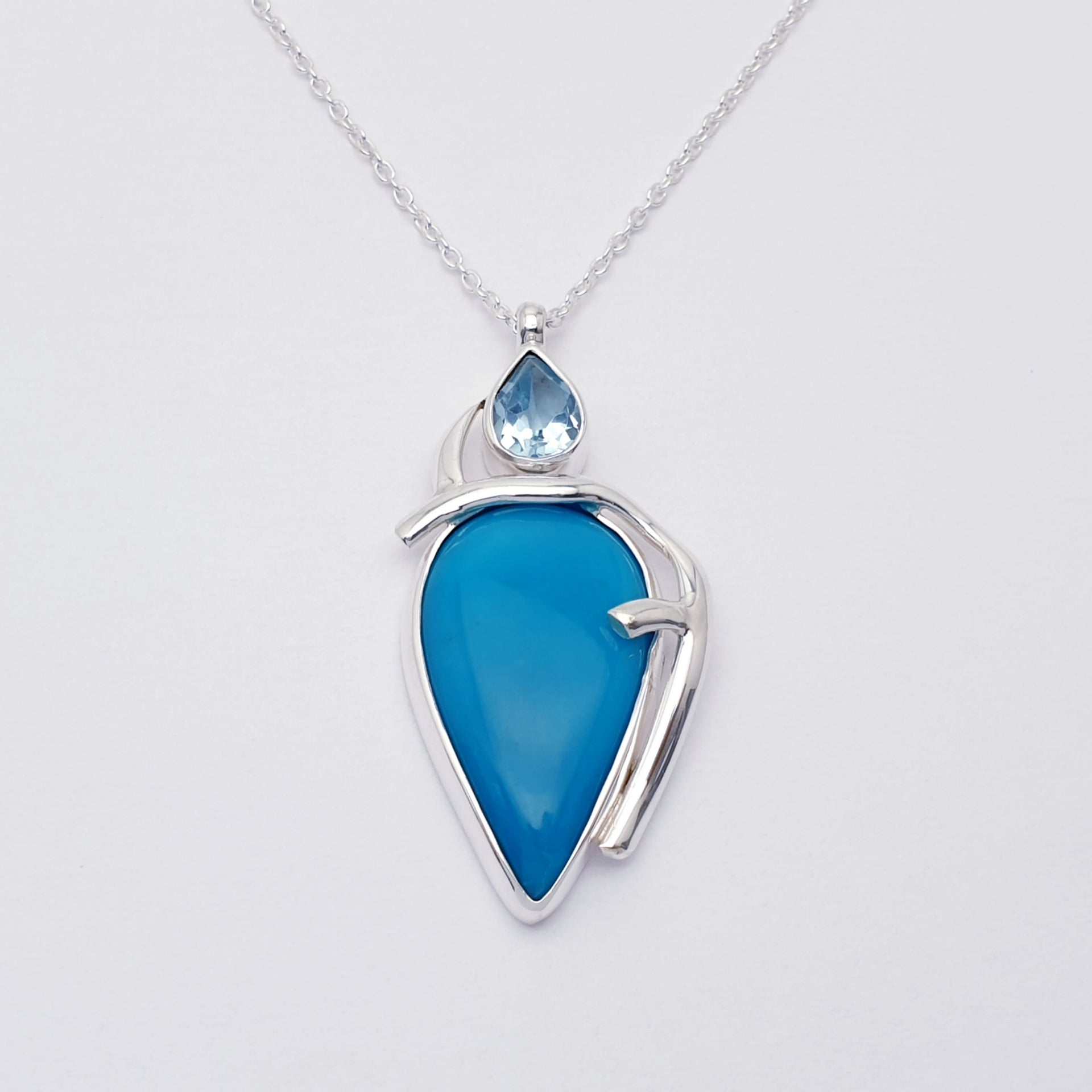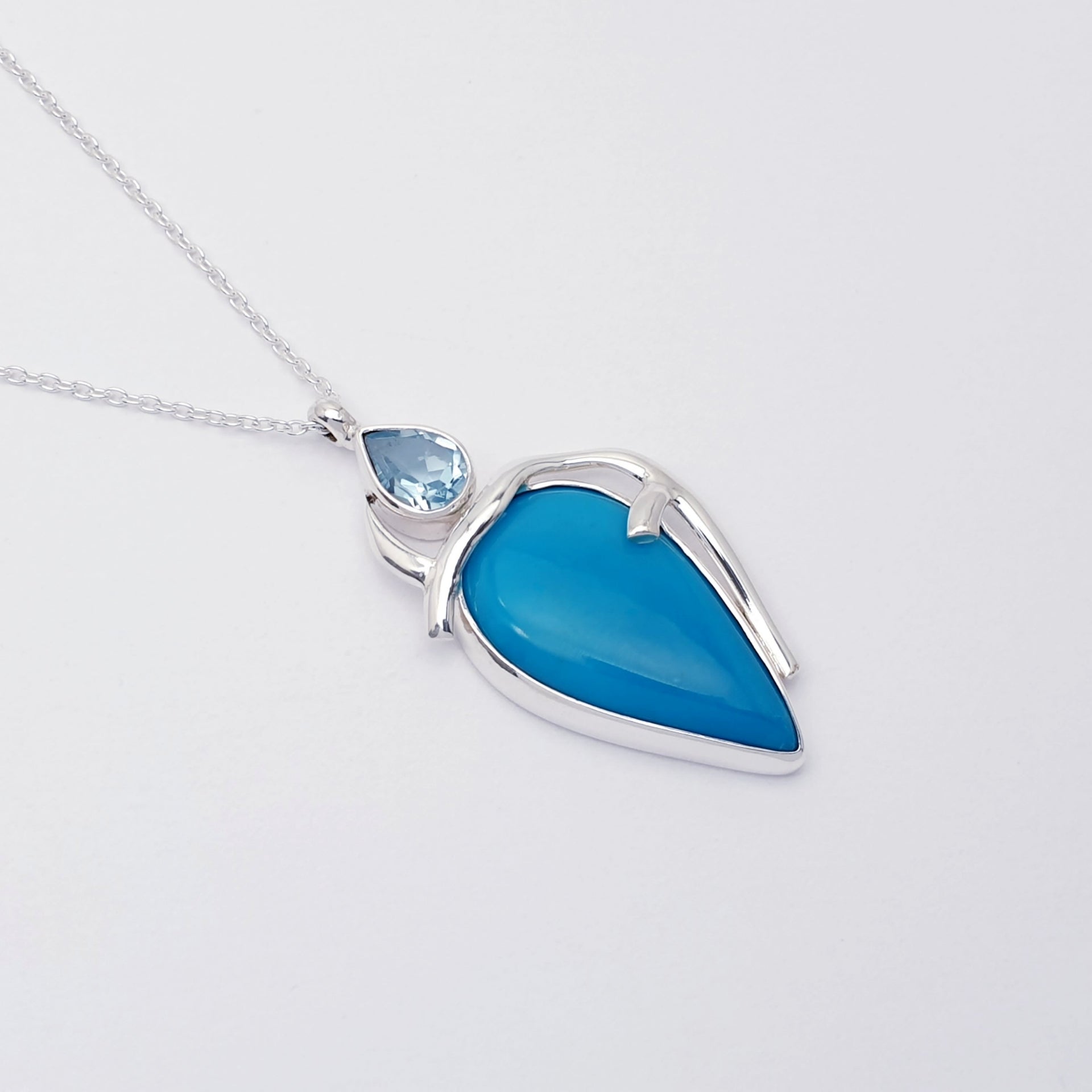 Our One-Off Turquoise and Blue Topaz Sterling Silver Chandra Necklace features a striking turquoise stone framed in flowing sterling silver, accented with a sparkling blue topaz at the top. Inspired by graceful curves and organic form, the design highlights the vivid blue tones of the stones while creating a sense of movement and balance. Completely unique, this necklace is a beautiful statement piece that celebrates colour, craftsmanship, and individuality.