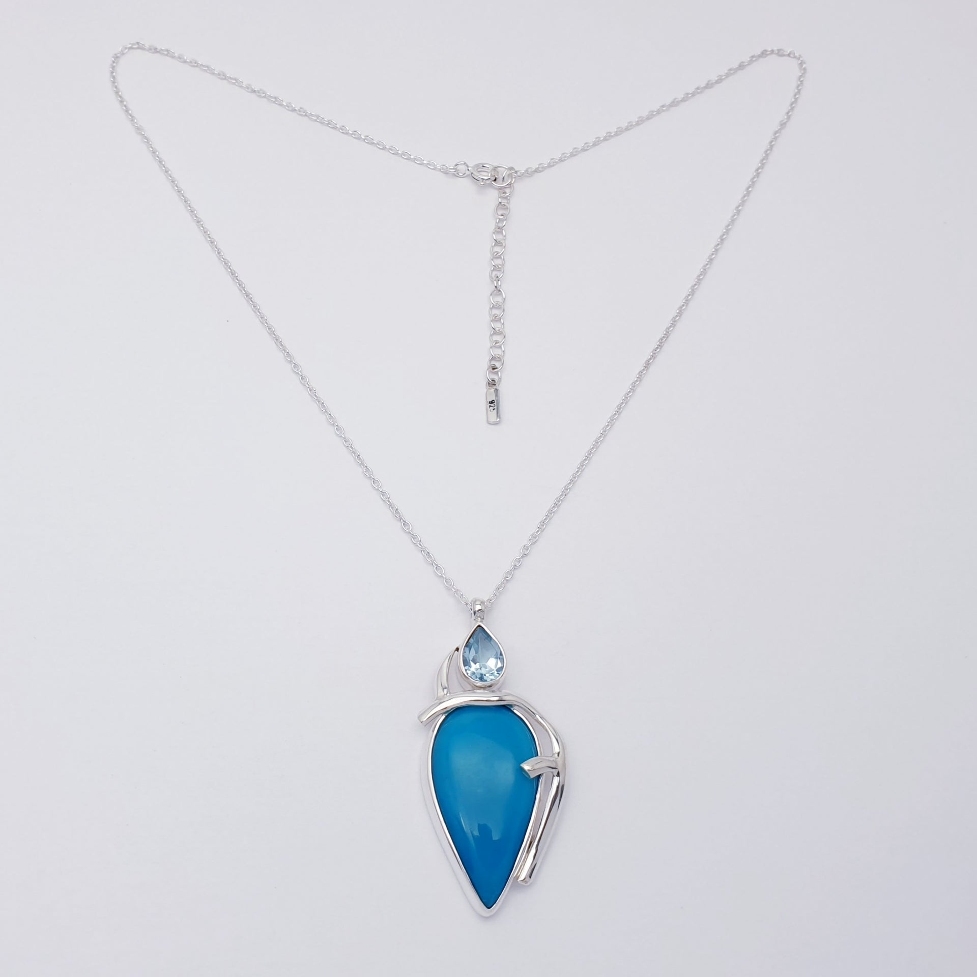 Dimensions: At widest points including bail approx. 4.2 cm Turquoise approx. 2.5 cm x 1.5 cm Blue Topaz approx. 0.8 cm x 0.5 cm. Necklace length, adjustable 16"-18"