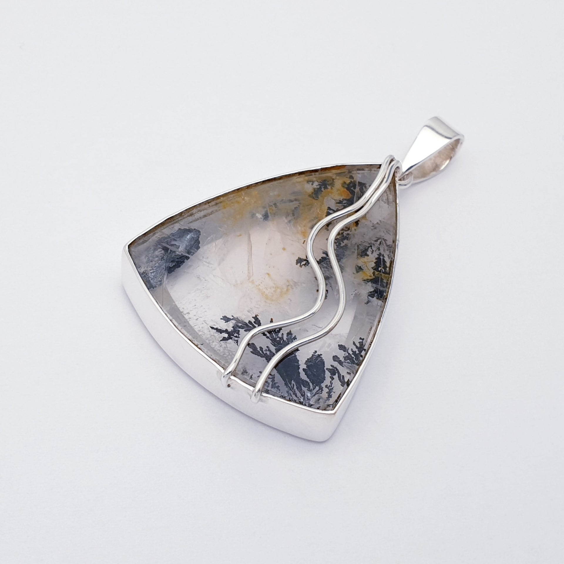 Our One-Off Sterling Silver Dendritic Quartz Pan Pendant features a stunning triangular Dendritic Quartz stone, beautifully framed in polished Sterling Silver and accented with flowing Silver lines. With its natural fern-like inclusions and soft, earthy tones, this unique piece captures the beauty of nature in a wearable work of art, perfect for everyday elegance.