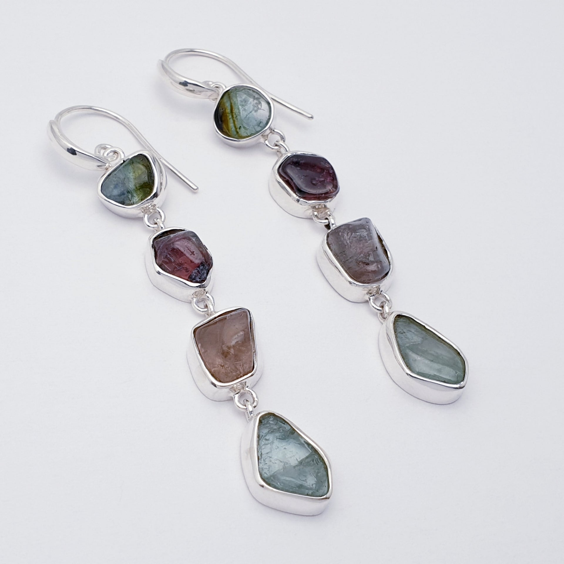 Our One-Off Mixed Tourmaline Sterling Silver Multistone Earrings are vibrant, contemporary statement pieces that celebrate the natural beauty of raw stones. Each earring features four cascading Tourmalines, showcasing an array of earthy greens, soft pinks, deep wine tones and cool aqua shades. Their organic, irregular cuts give every stone its own personality, while the sleek Sterling Silver settings create a refined contrast that highlights their natural textures and colours.