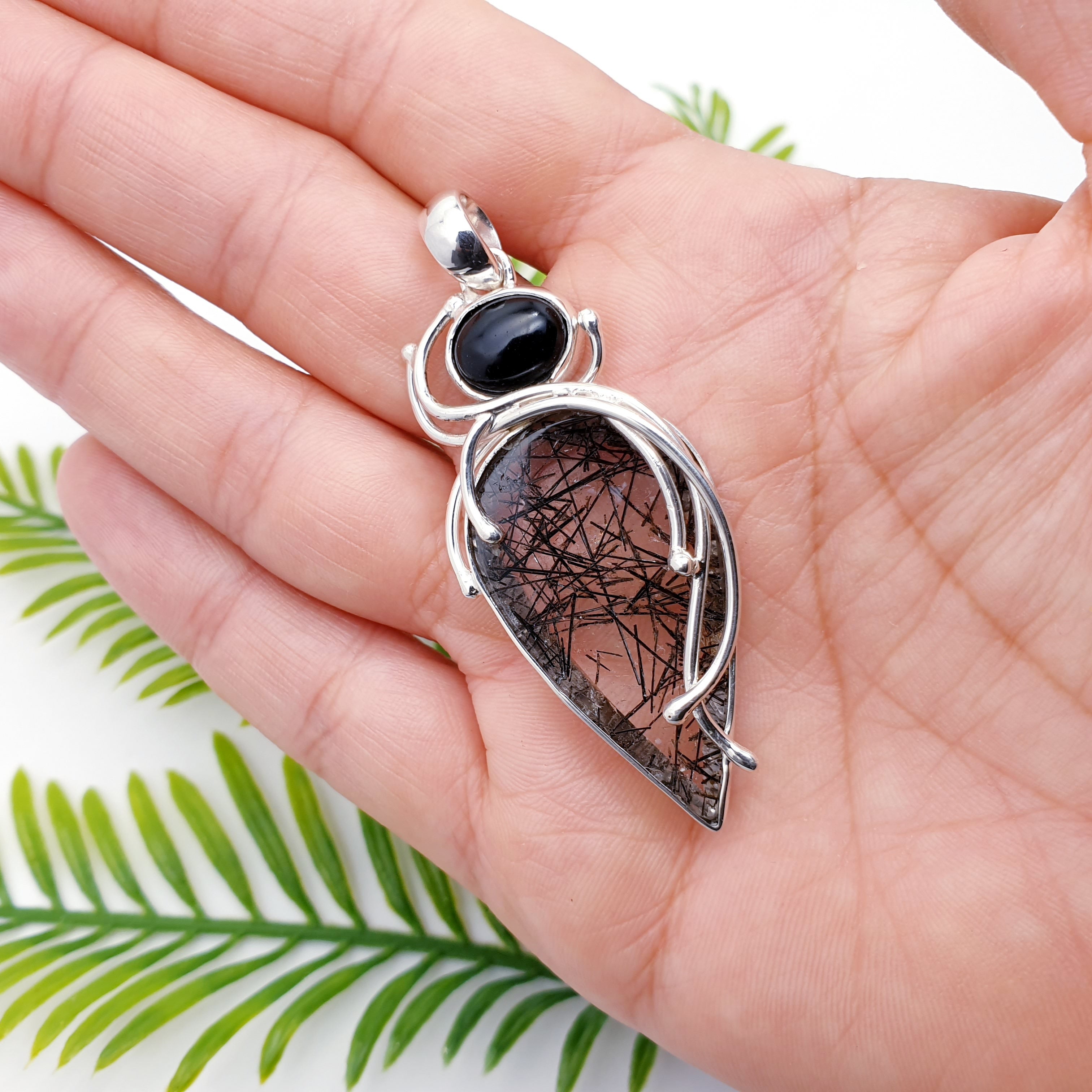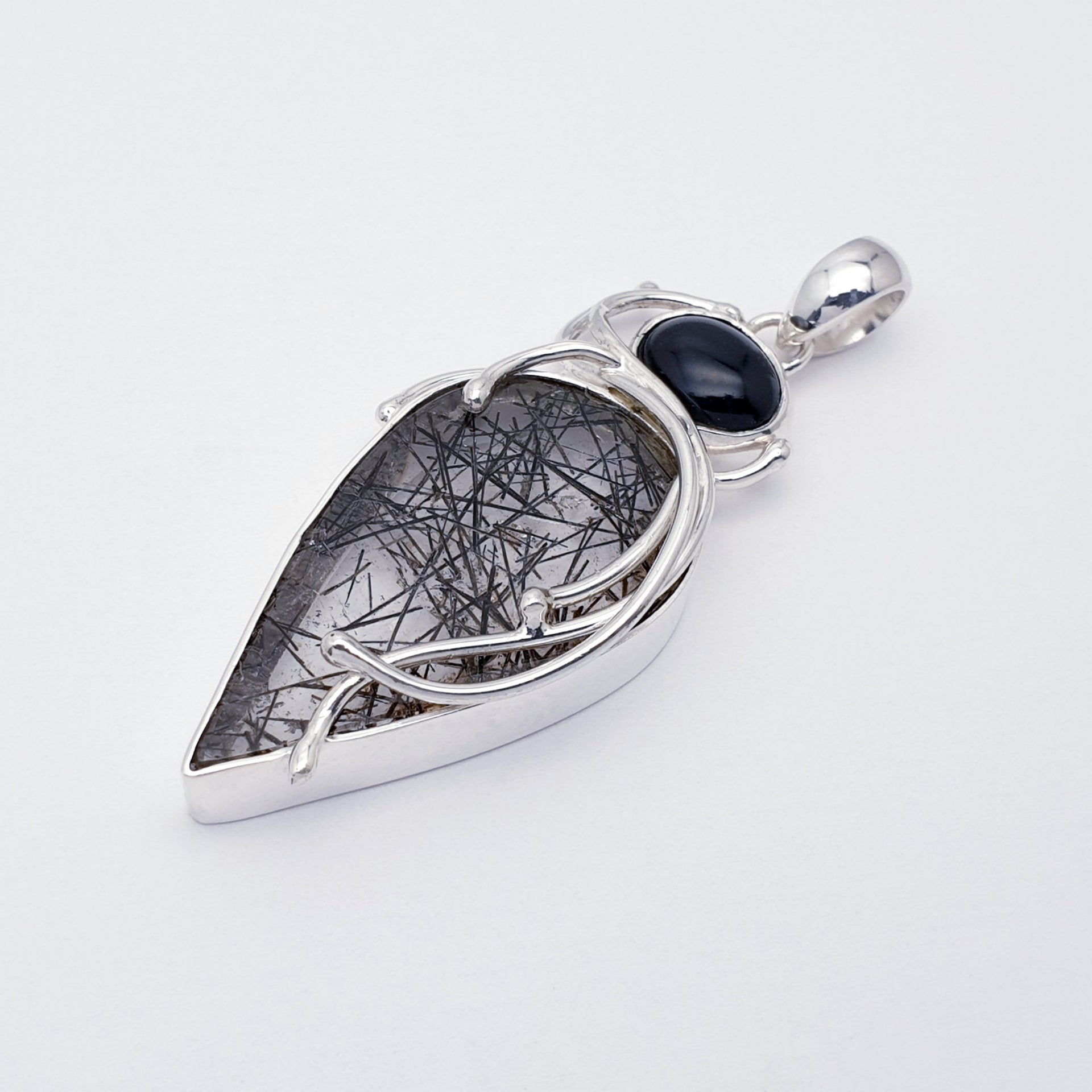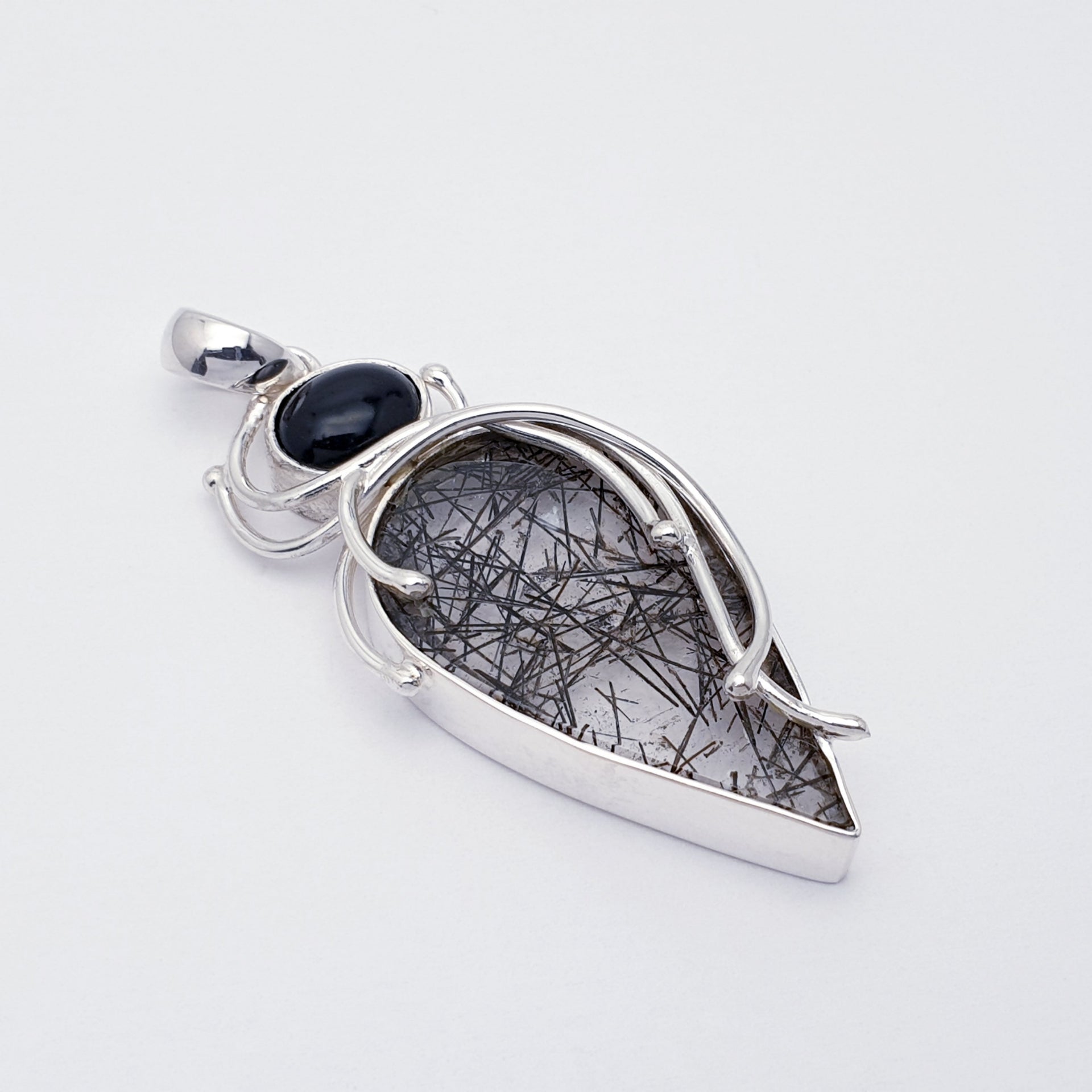 Our One-Off Tourmalinated Quartz & Onyx Sterling Silver Apollo Pendant features a striking teardrop Tourmalinated Quartz stone topped with a polished black Onyx. Intricate flowing silver detailing wraps around the stones, creating an elegant, sculptural design full of contrast and character. Bold, unique, and effortlessly stylish, this piece is perfect for making a statement.