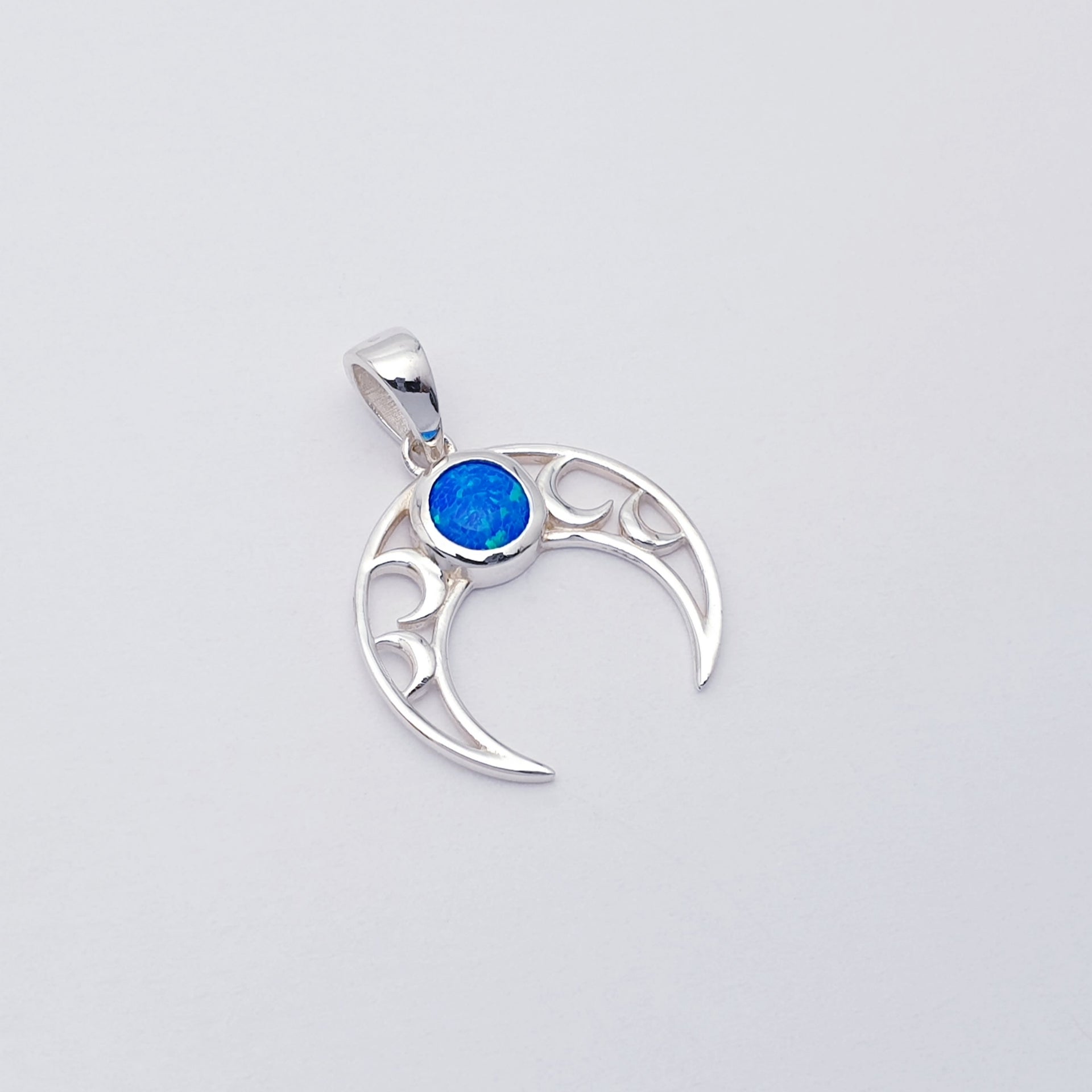 The graceful inverted crescent symbolizes intuition, renewal, and feminine energy. Set within the moon’s curve, luminous reconstituted Opal shimmers with flashes of iridescent colour, creating a captivating contrast against the polished silver. Each movement catches the light, giving the pendant a soft, otherworldly glow.