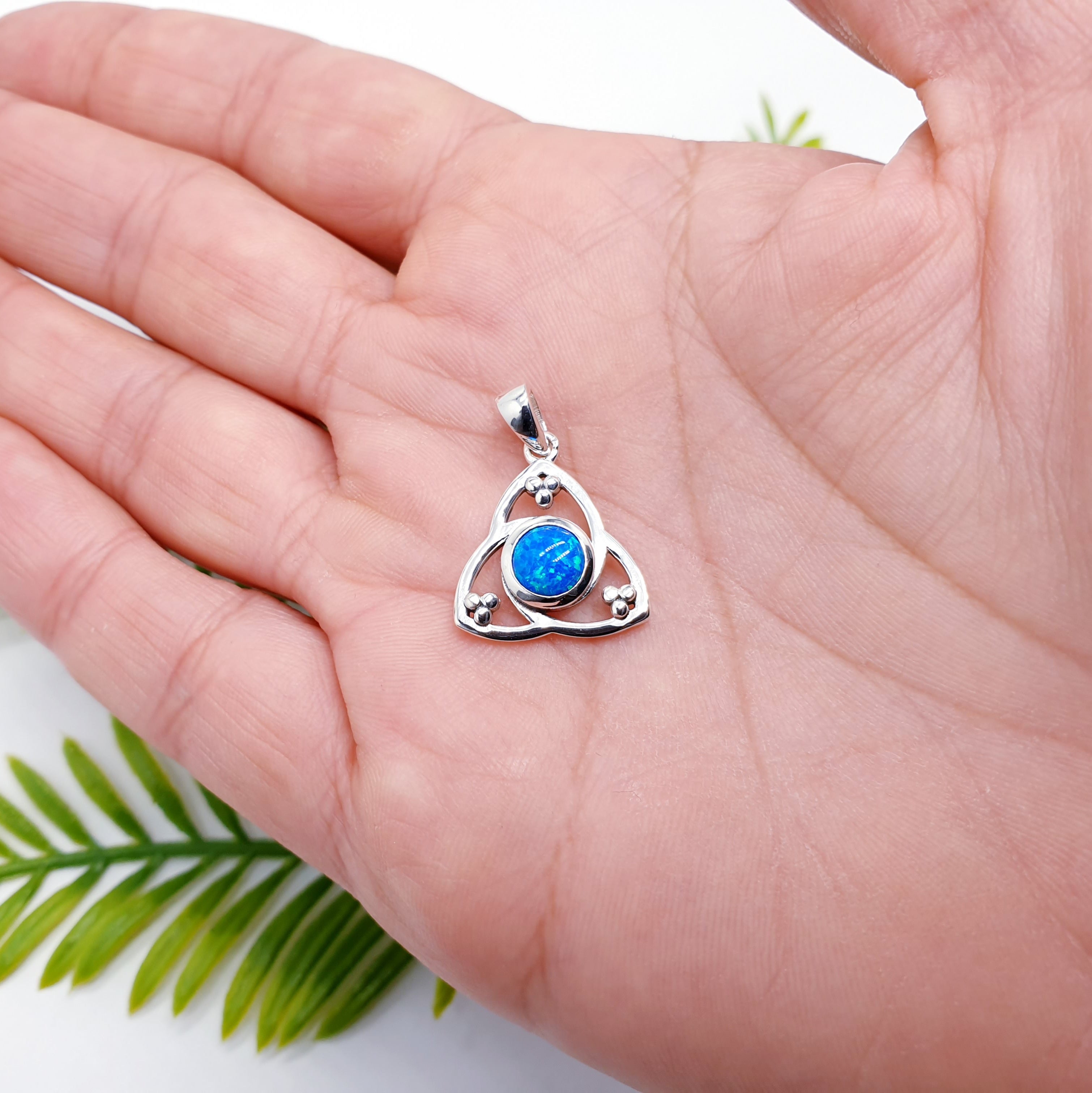 Celebrate timeless symbolism and luminous beauty with our Reconstituted Opal Sterling Silver Triquetra pendant.