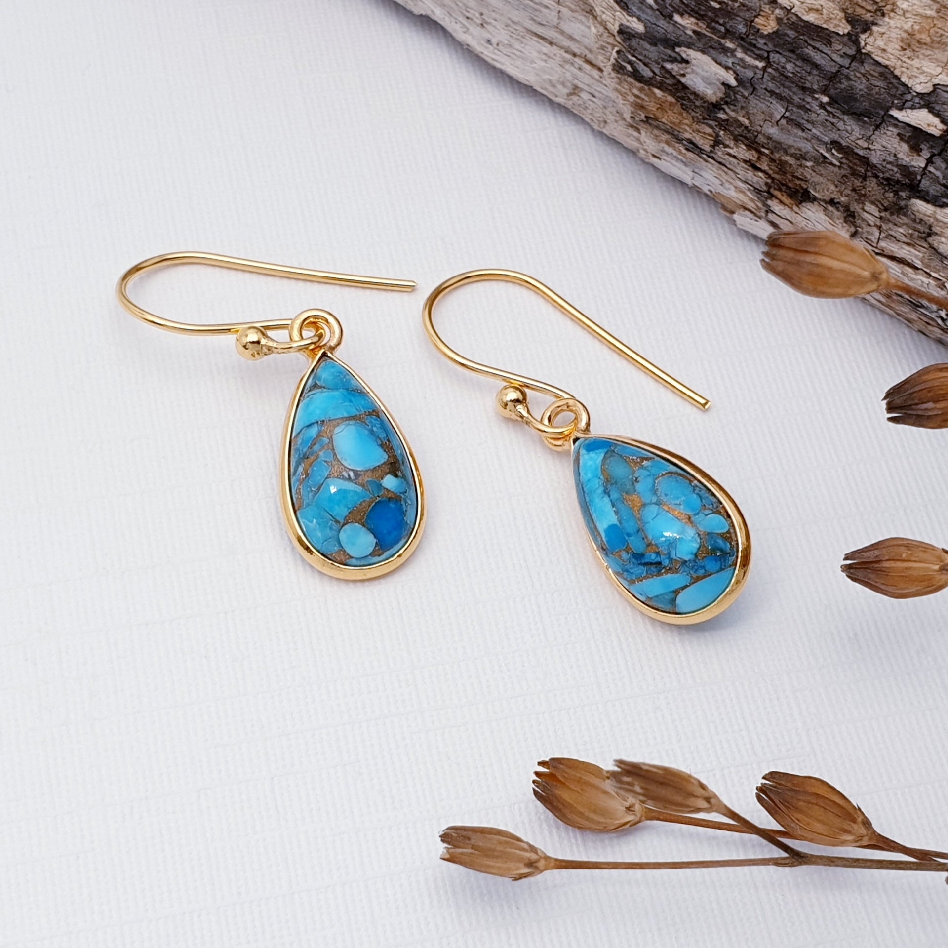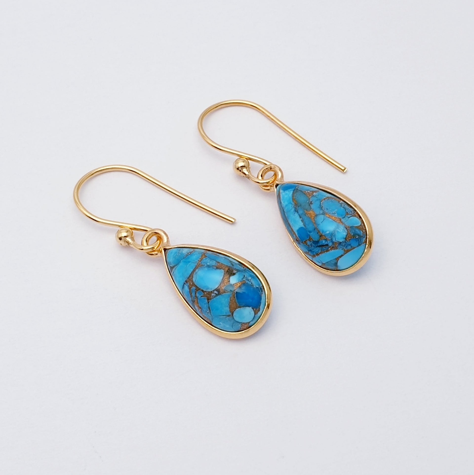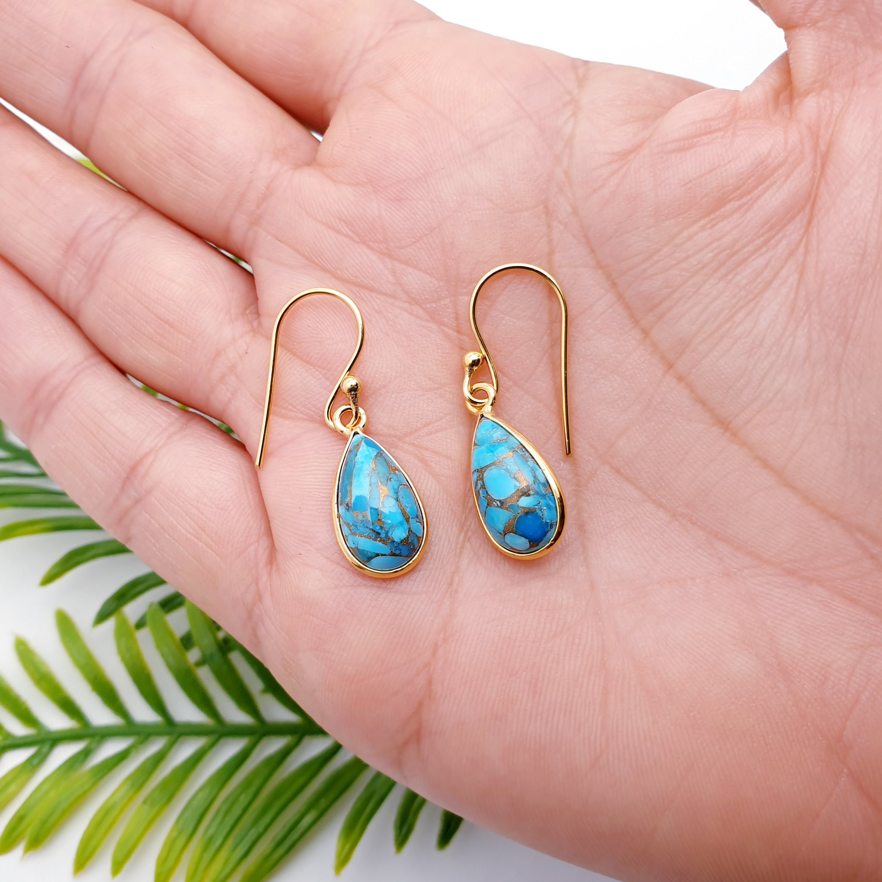 Our Turquoise 18ct Gold Plated Sterling Silver Teardrop Earrings feature beautifully shaped Turquoise stones set in warm gold-plated silver. Each stone displays unique natural patterning, making every pair subtly individual. The graceful teardrop form and rich blue tones create an eye-catching yet refined design, perfect for adding a pop of colour to both everyday and occasion looks.
